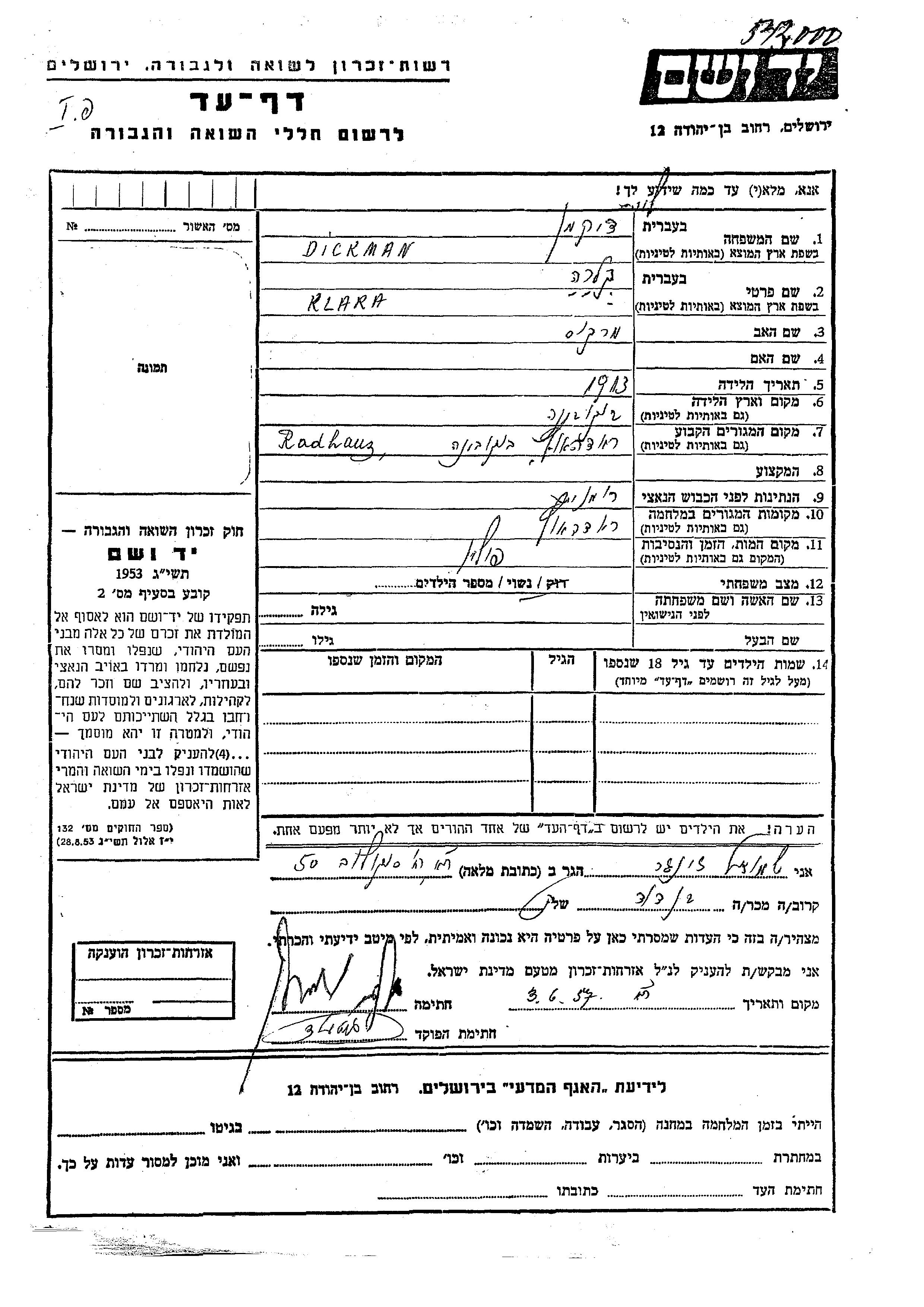 Klara Dickman wurde im Jahr 1913 in Bukovina, Rumänien geboren. Sie war die Tochter von Markus. Sie war Verheiratet. Vor dem Zweiten Weltkrieg lebte sie in Radautz, Rumänien. Während des Krieges war sie in Radautz, Rumänien.