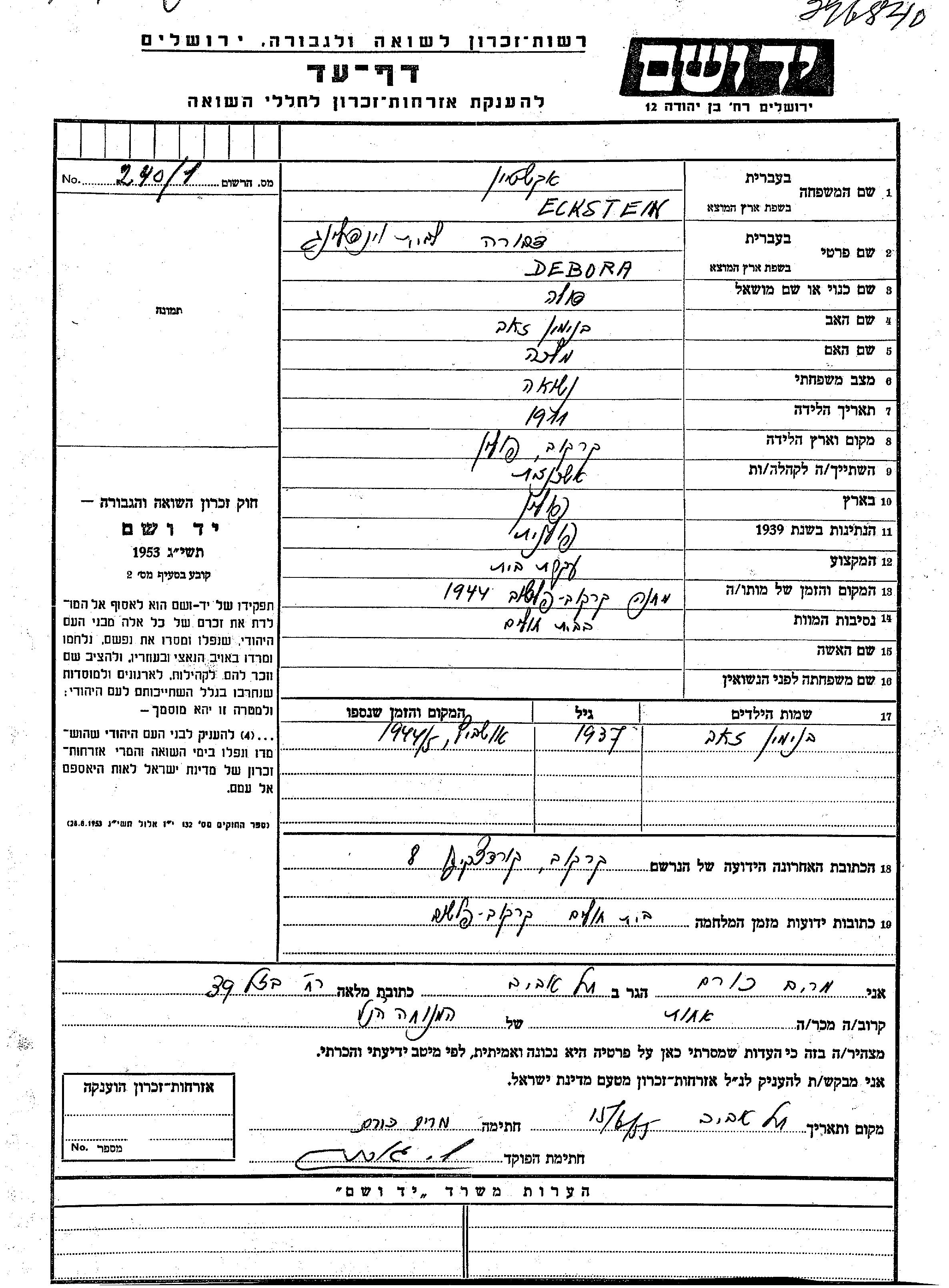 Debora Eckstein, geb. Veindling wurde im Jahr 1911 in Krakow, Polen geboren. Sie war die Tochter von Beniamin Zeev und Malka. Sie war Hausfrau. Vor dem Zweiten Weltkrieg lebte sie in Krakow, Polen. Während des Krieges war sie in Krakow, Polen.