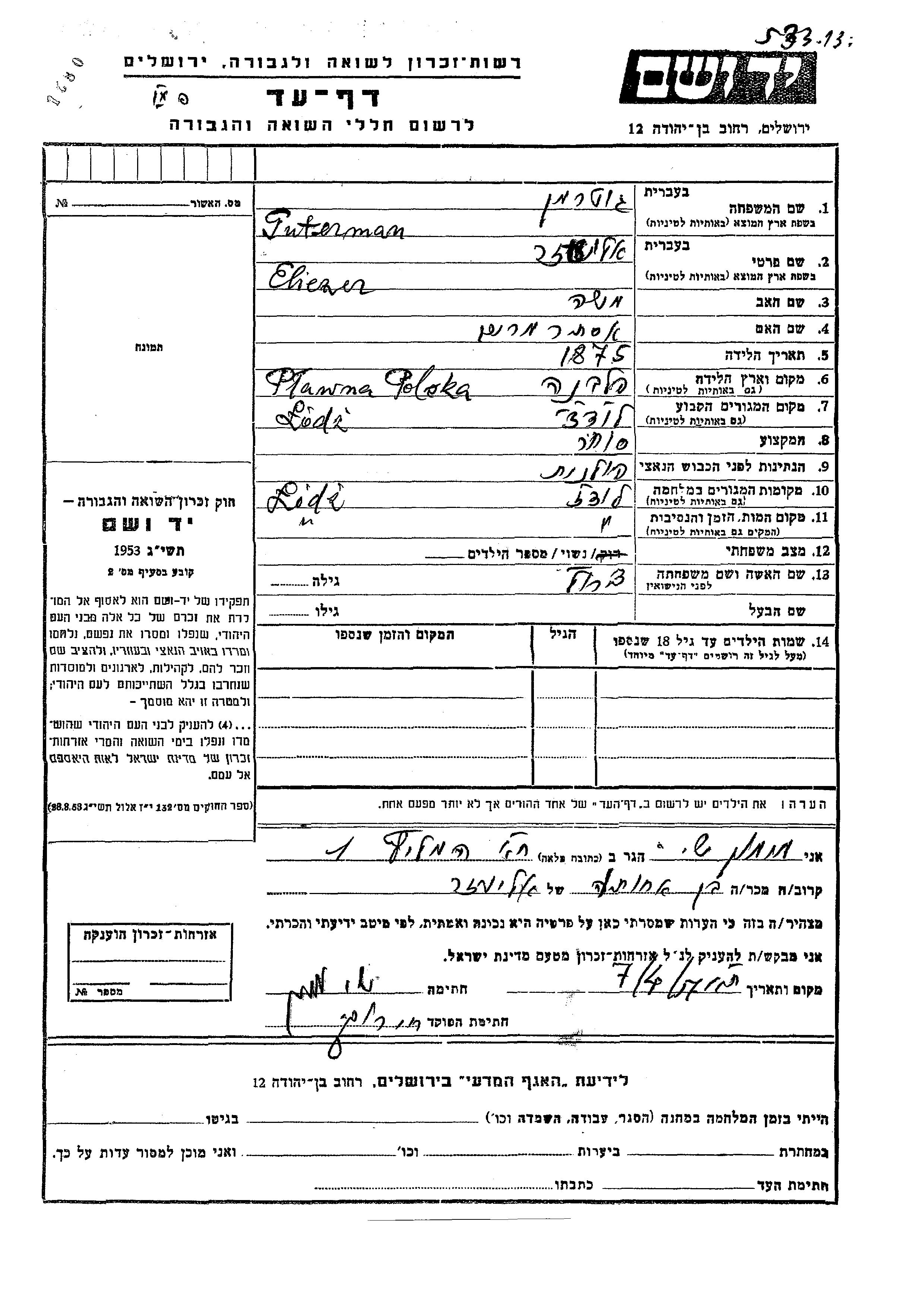 Elieser Guterman wurde im Jahr 1875 in Plawno, Polen geboren. Er war der Sohn von Moshe und Ester Miriam. Er war Kaufmann/-frau und mit Tzira Verheiratet. Vor dem Zweiten Weltkrieg lebte er in Lodz, Polen. Während des Krieges war er in Lodz, Polen.