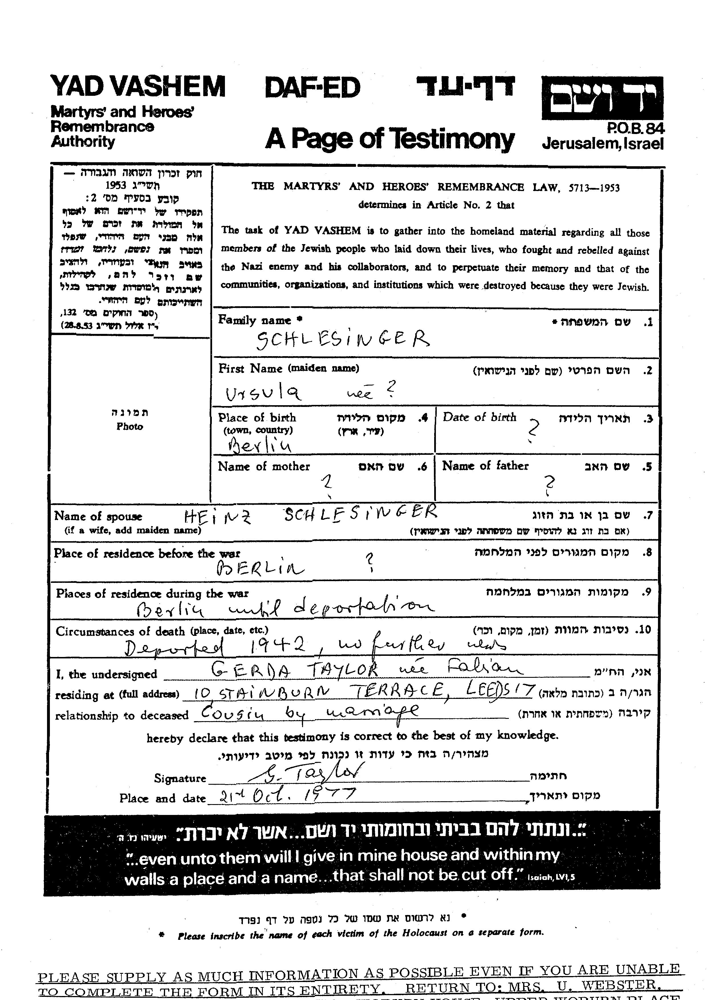 Ursula wurde in der Schoah ermordet. Todesort: unbekannt im Jahr 1942.