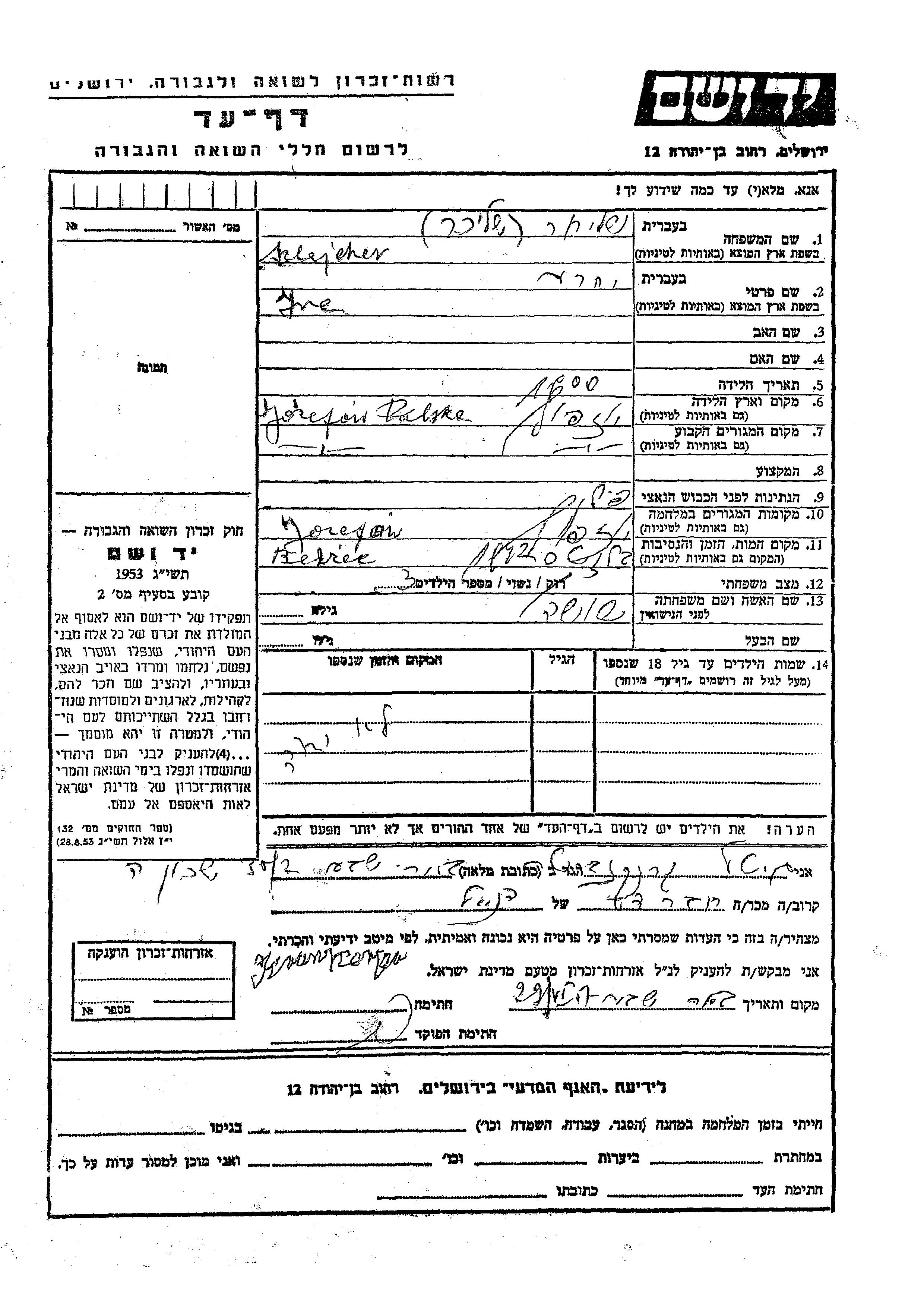 Yre Ire Szlajcher wurde im Jahr 1900 in Jozefow, Polen geboren. Er war mit Shosha Verheiratet. Vor dem Zweiten Weltkrieg lebte er in Jozefow, Polen. Während des Krieges war er in Jozefow, Polen.