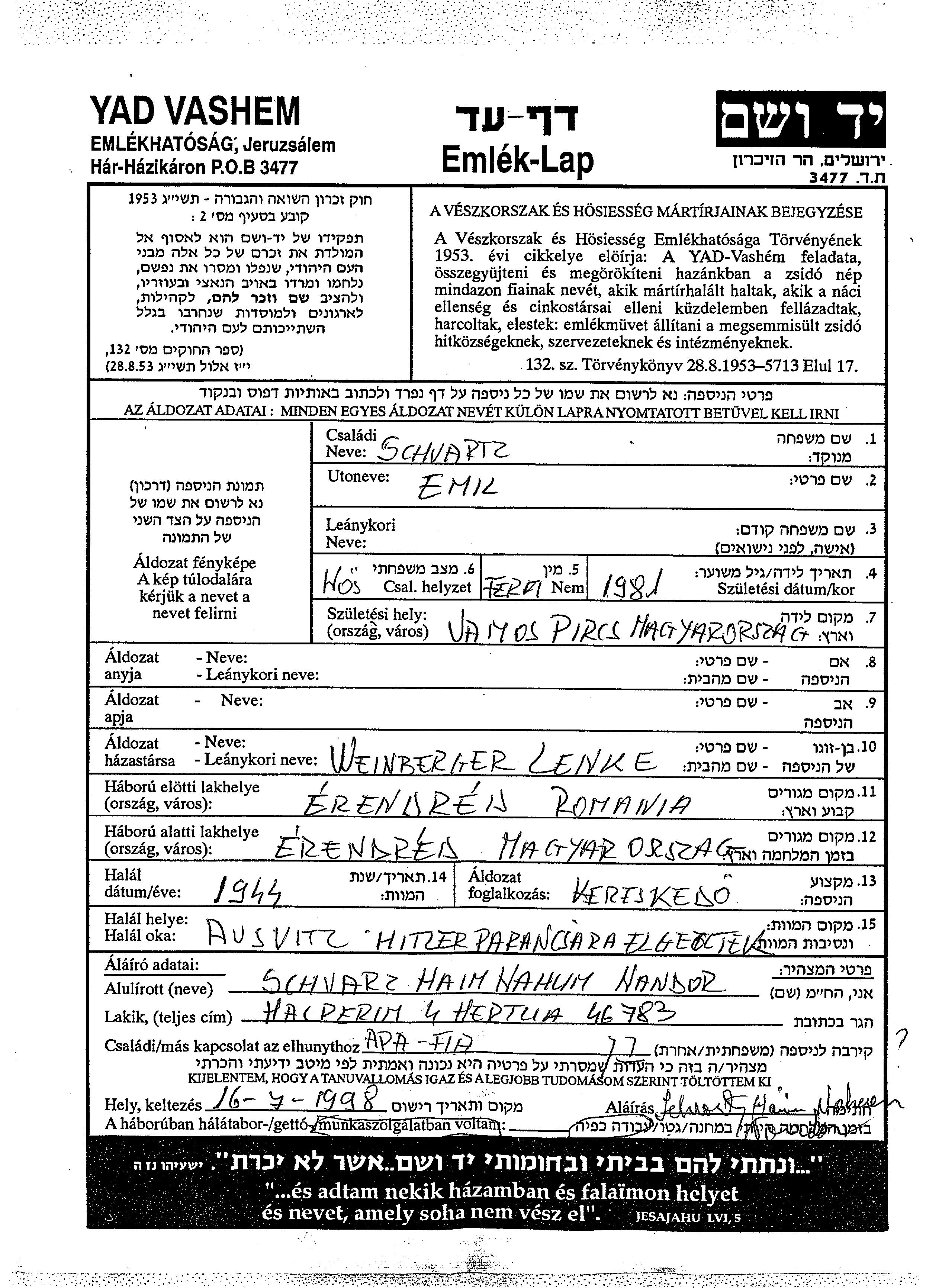 Emil Schvartz wurde im Jahr 1881 in Vamos, Ungarn geboren. Er war Kaufmann/-frau und mit Lenke, geb. Weinberger Verheiratet. Vor dem Zweiten Weltkrieg lebte er in Erendred, Rumänien. Während des Krieges war er in Erendred, Rumänien.