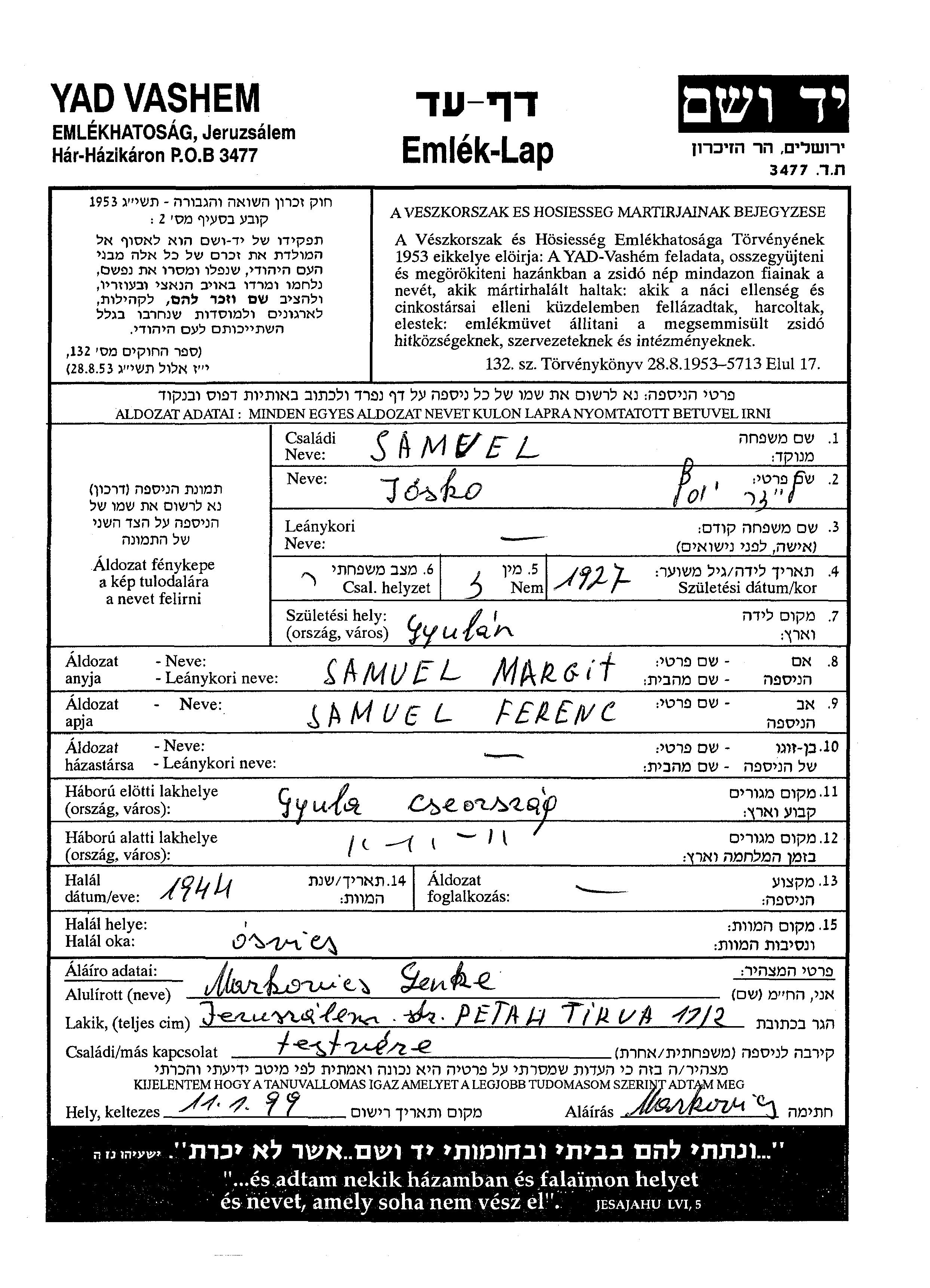 Josko Leizer Samuel wurde im Jahr 1927 in Dula, Tschechoslowakei geboren. Er war der Sohn von Ferentz und Margit. Er war Ledig. Vor dem Zweiten Weltkrieg lebte er in Dula, Tschechoslowakei. Während des Krieges war er in Gyula, Tschechoslowakei.