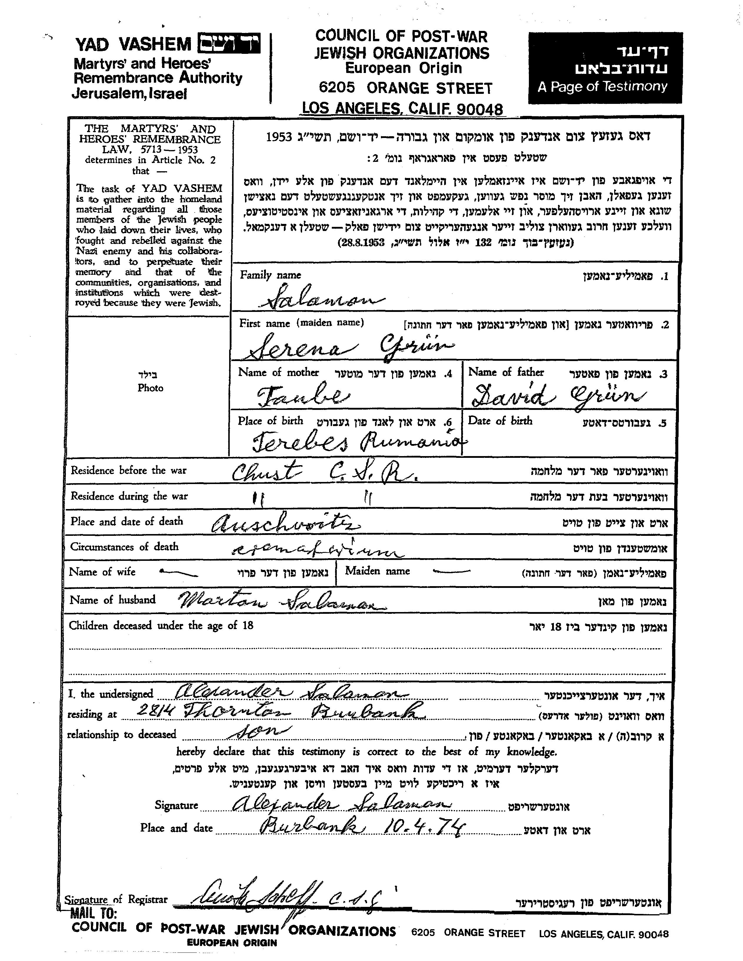 Serena Salamon, geb. Grun wurde in Terebes, Rumänien geboren. Sie war die Tochter von David und Tauba. Sie war mit Martan Verheiratet. Vor dem Zweiten Weltkrieg lebte sie in Chust, Tschechoslowakei. Während des Krieges war sie in Chust, Tschechoslowakei.