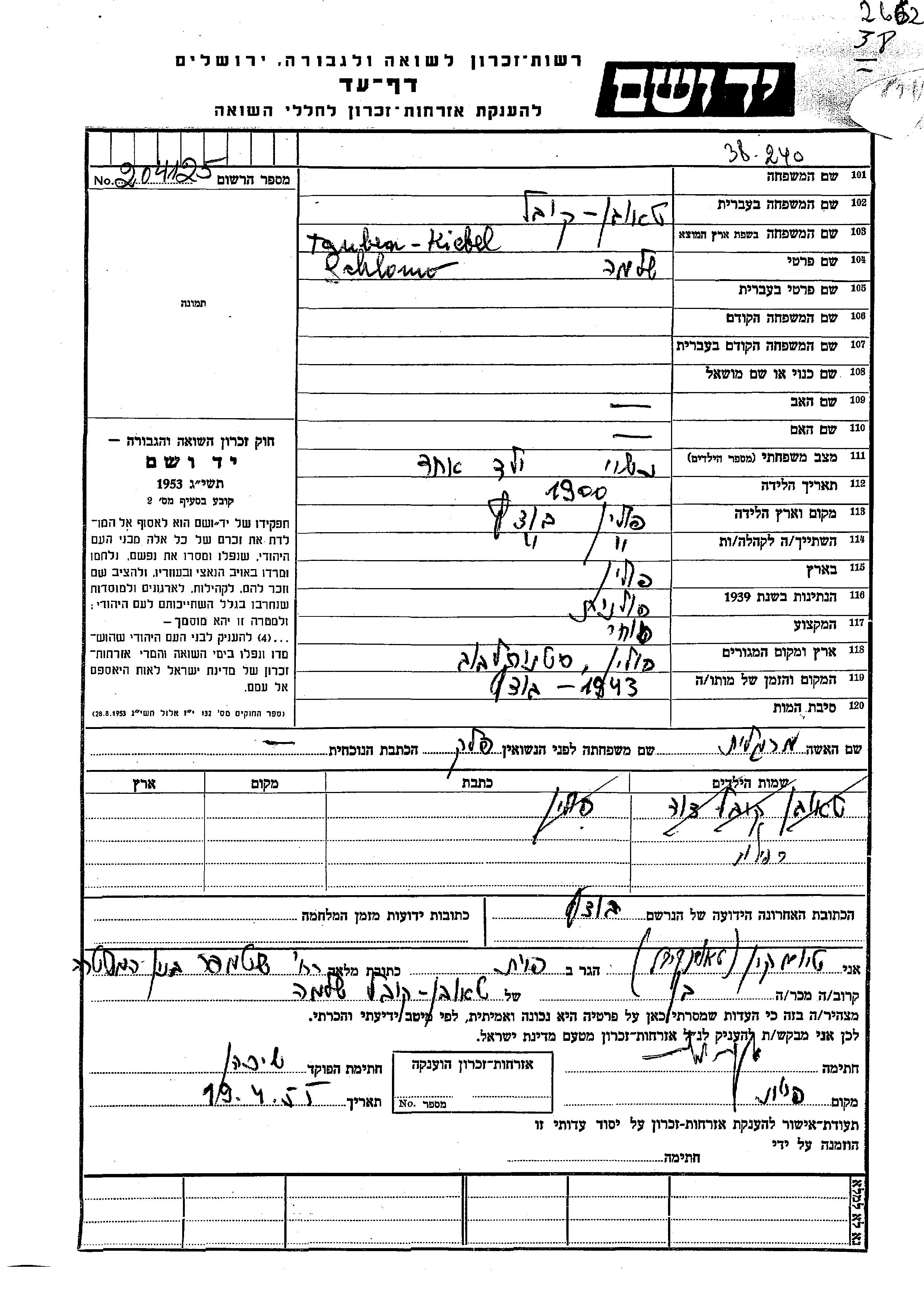 Schlomo Tauben Kiebel wurde im Jahr 1900 in Buczacz, Polen geboren. Er war Kaufmann/-frau und mit Margalit, geb. Falk Verheiratet.