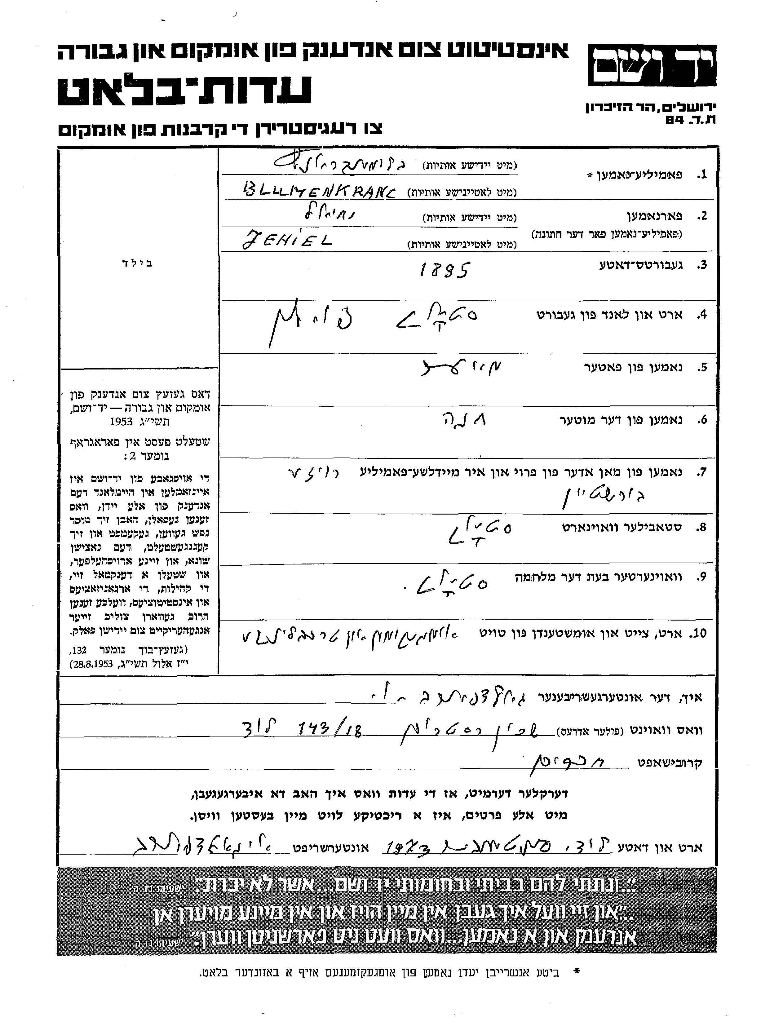 Blumenkranc Jehiel 1895 Stok, Polen Gedenkblatt