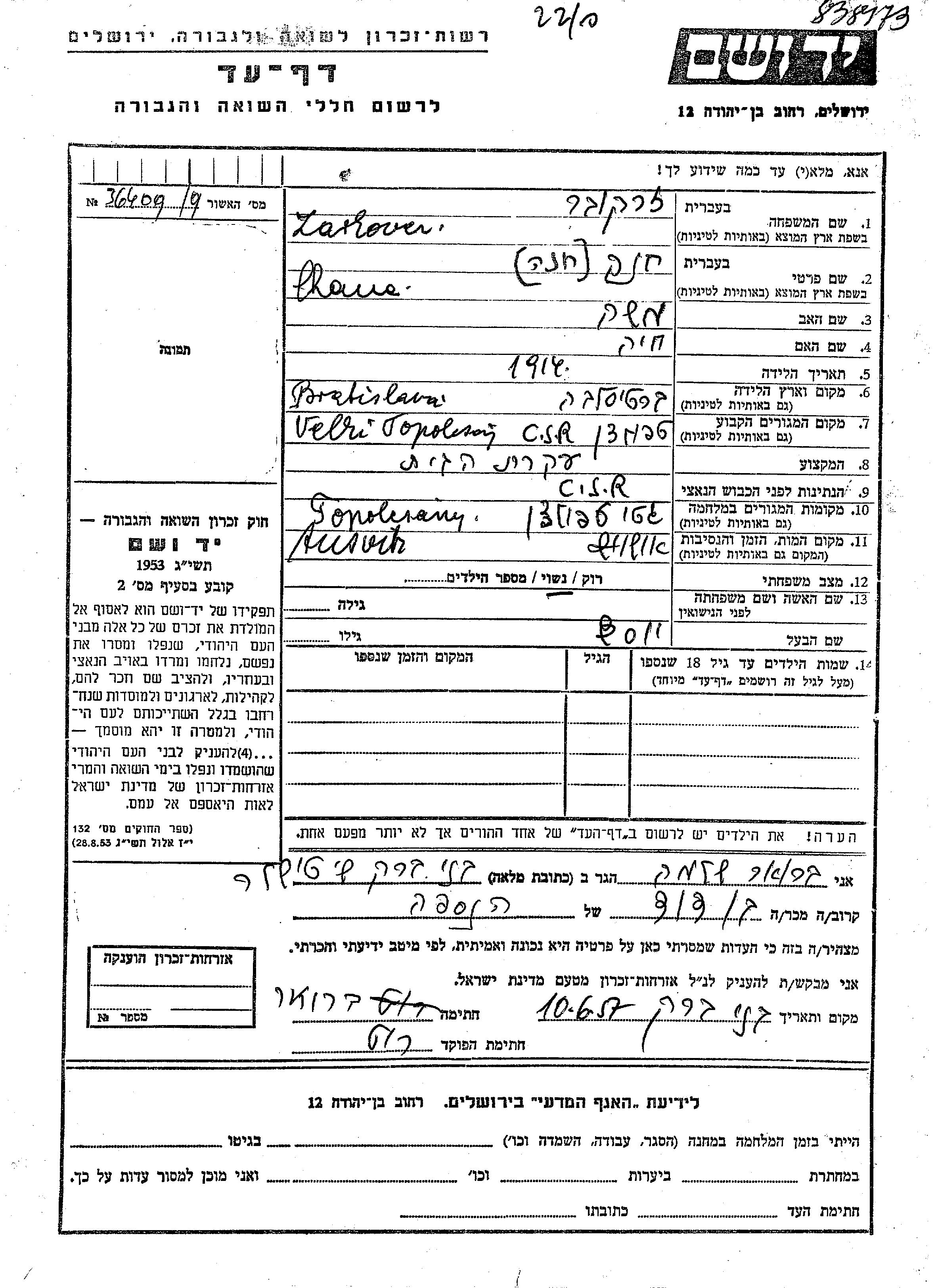 Chane Zarkover wurde im Jahr 1914 in Bratislava, Tschechoslowakei geboren. Sie war die Tochter von Moshe und Khaia. Sie war Hausfrau und mit Yosef Verheiratet. Vor dem Zweiten Weltkrieg lebte sie in Topolczan, Tschechoslowakei. Während des Krieges war sie in Topolczan, Tschechoslowakei.