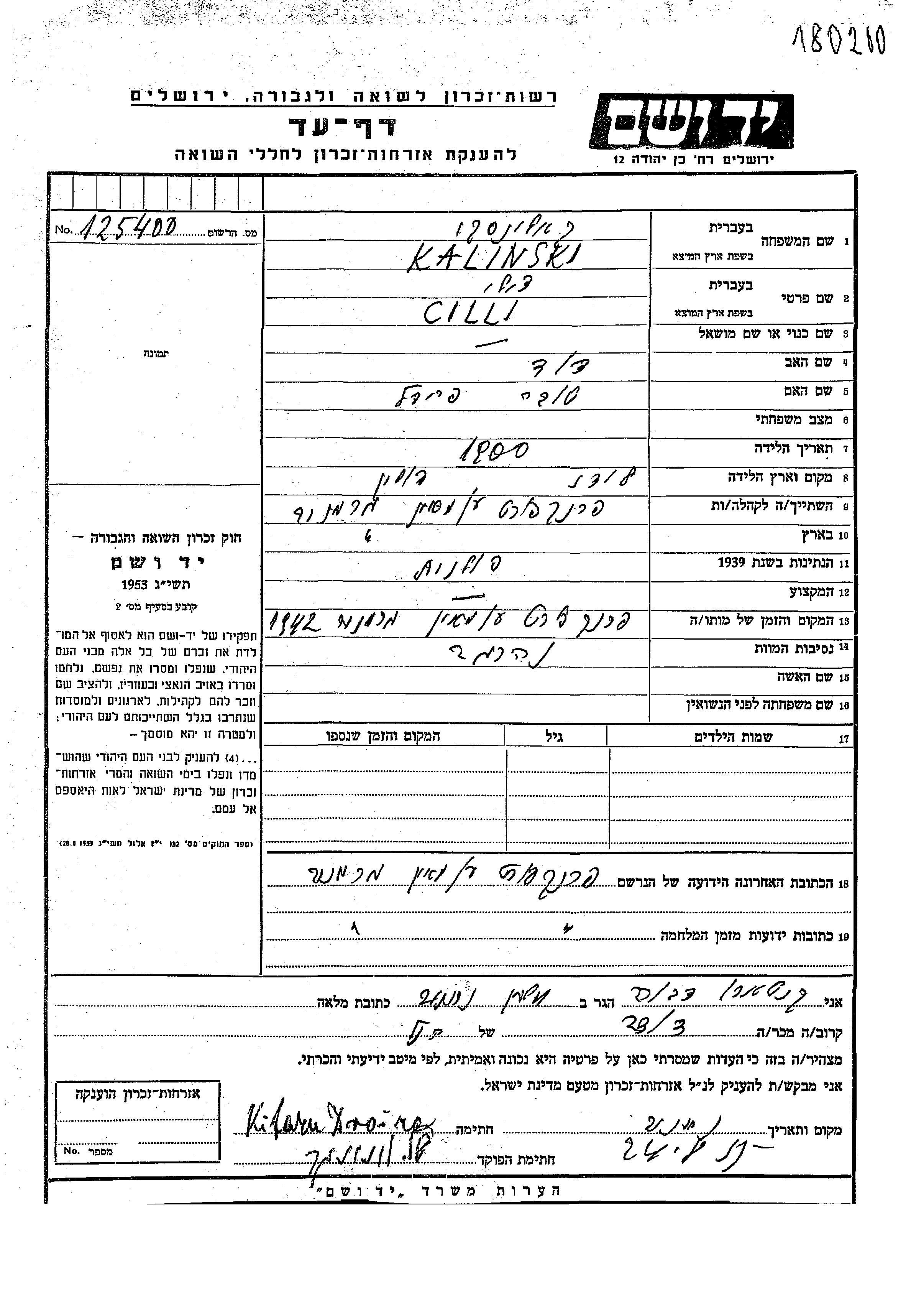 Cilli Kalinski wurde im Jahr 1900 in Lodz, Polen geboren. Sie war die Tochter von David und Tova Fridl. Vor dem Zweiten Weltkrieg lebte sie in Frankenau, Deutsches Reich. Während des Krieges war sie in Frankfurt, Deutsches Reich.