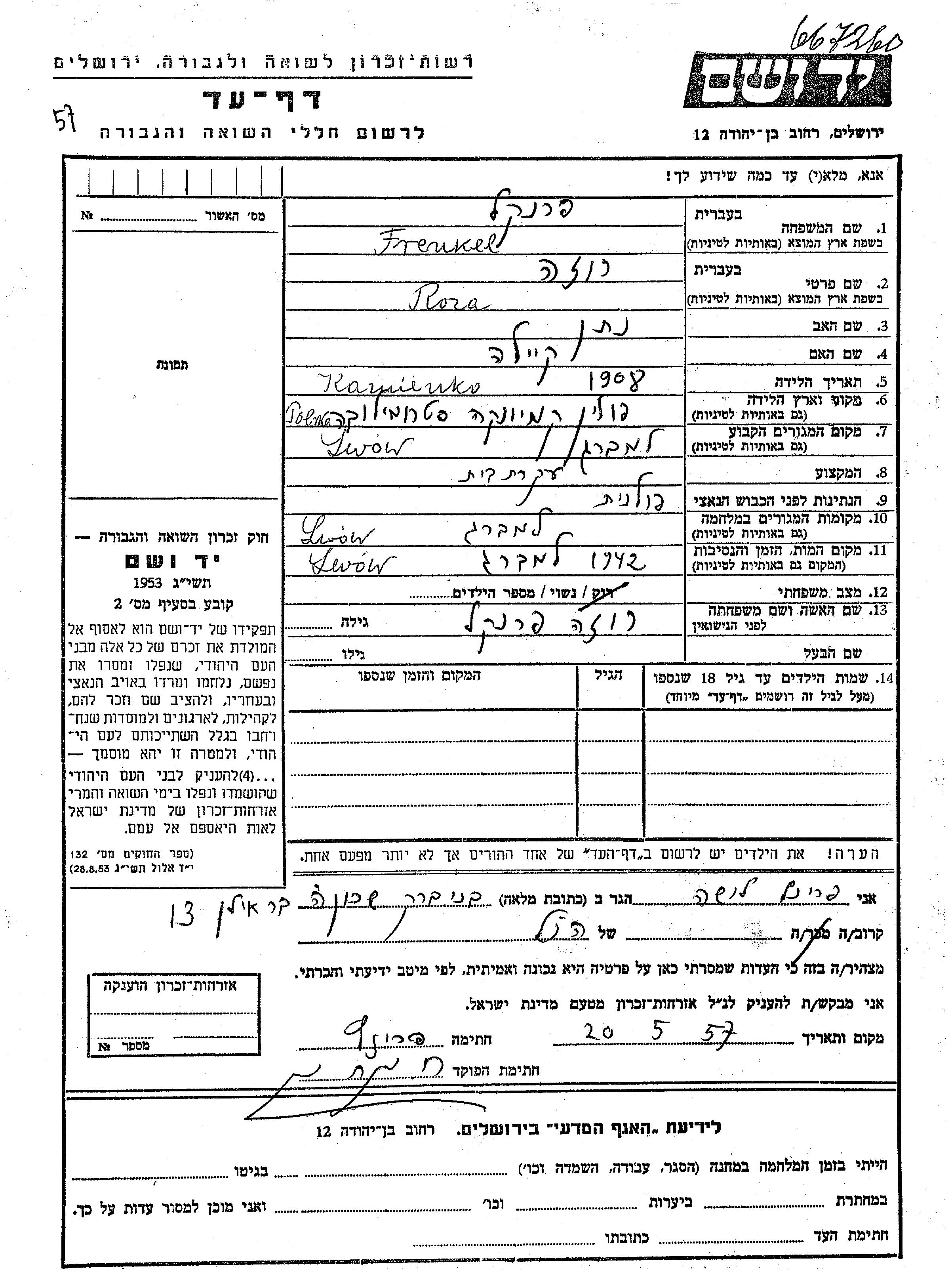 Roza Frenkel wurde im Jahr 1908 in Kamionka Strumiłowa, Polen geboren. Sie war die Tochter von Natan und Keila. Sie war Verheiratet. Vor dem Zweiten Weltkrieg lebte sie in Lwow, Polen. Während des Krieges war sie in Lwow, Polen.