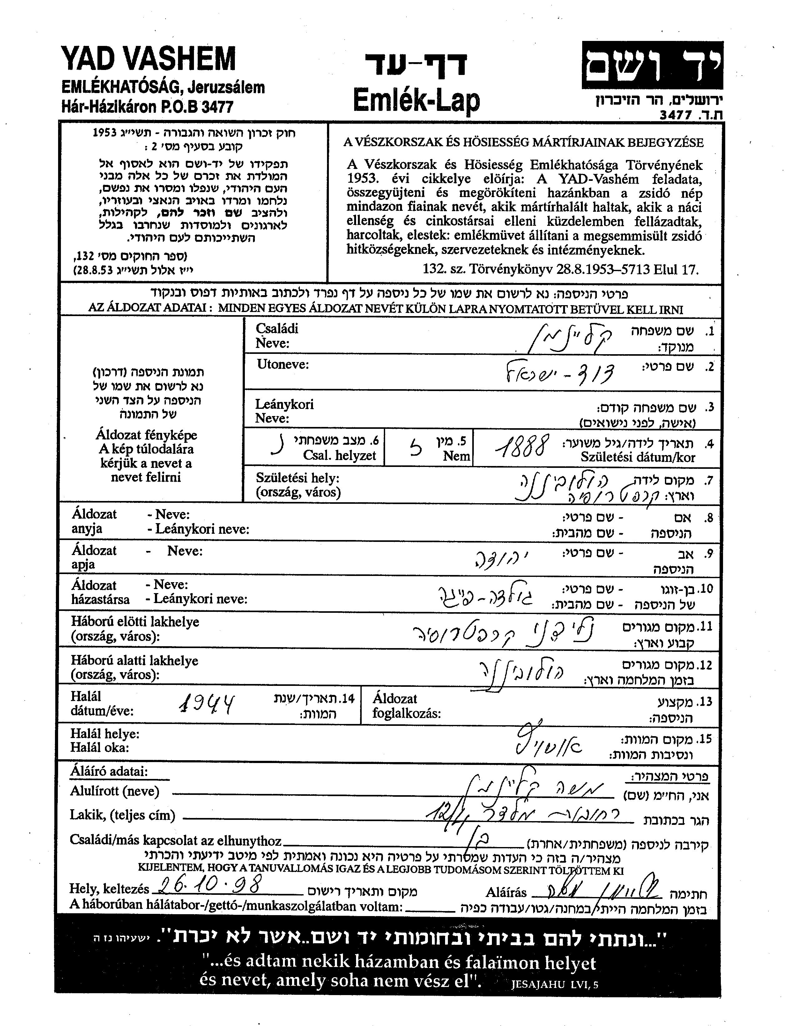 Kleinman David Yisrael 1888 Nalipena, Tschechoslowakei Gedenkblatt