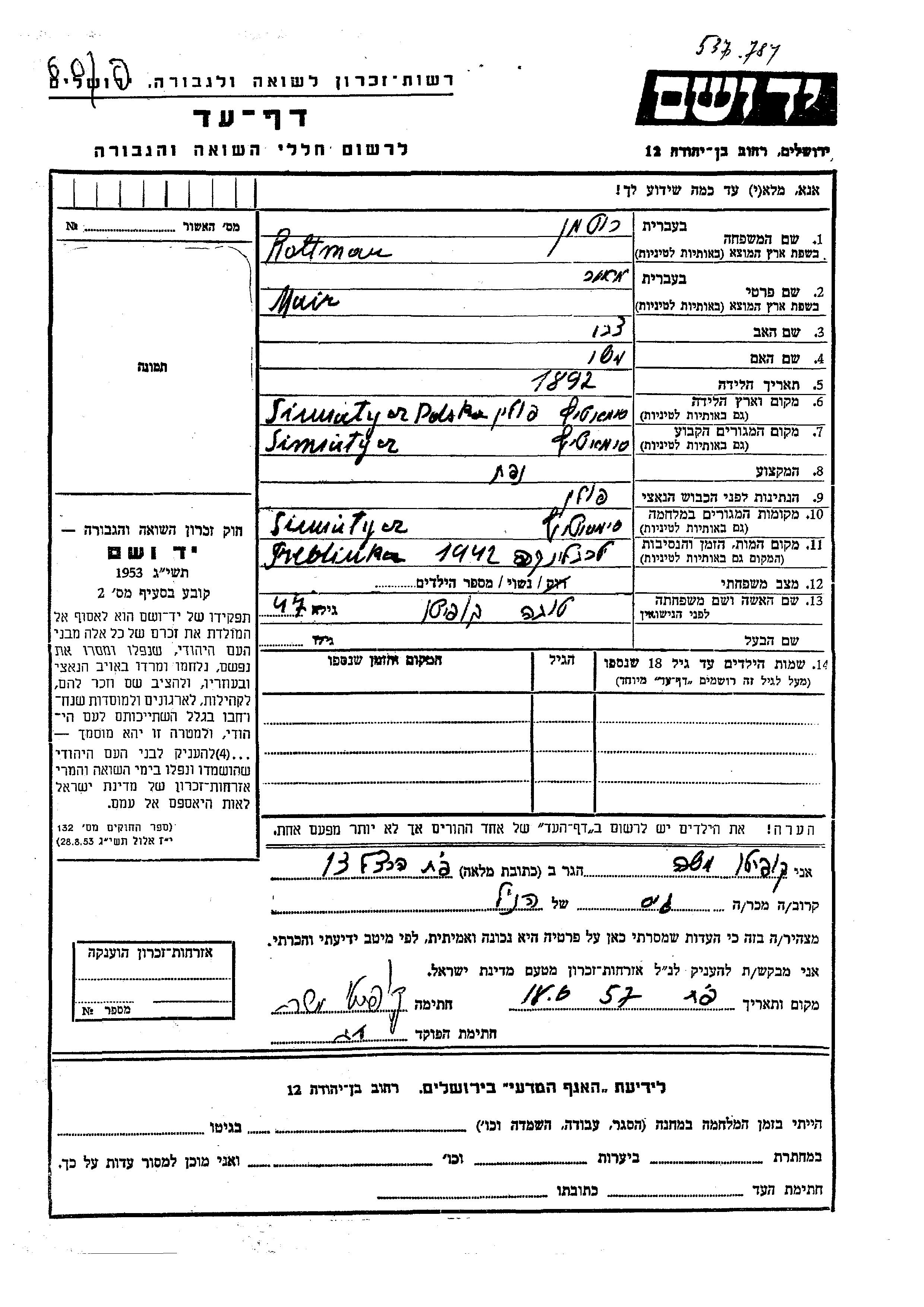 Mair Rotman wurde im Jahr 1892 in Siemiatycze, Polen geboren. Er war der Sohn von Tzvi und Meshu. Er war Schmied und mit Tova, geb. Kopito Verheiratet. Vor dem Zweiten Weltkrieg lebte er in Siemiatycze, Polen. Während des Krieges war er in Siemiatycze, Polen.