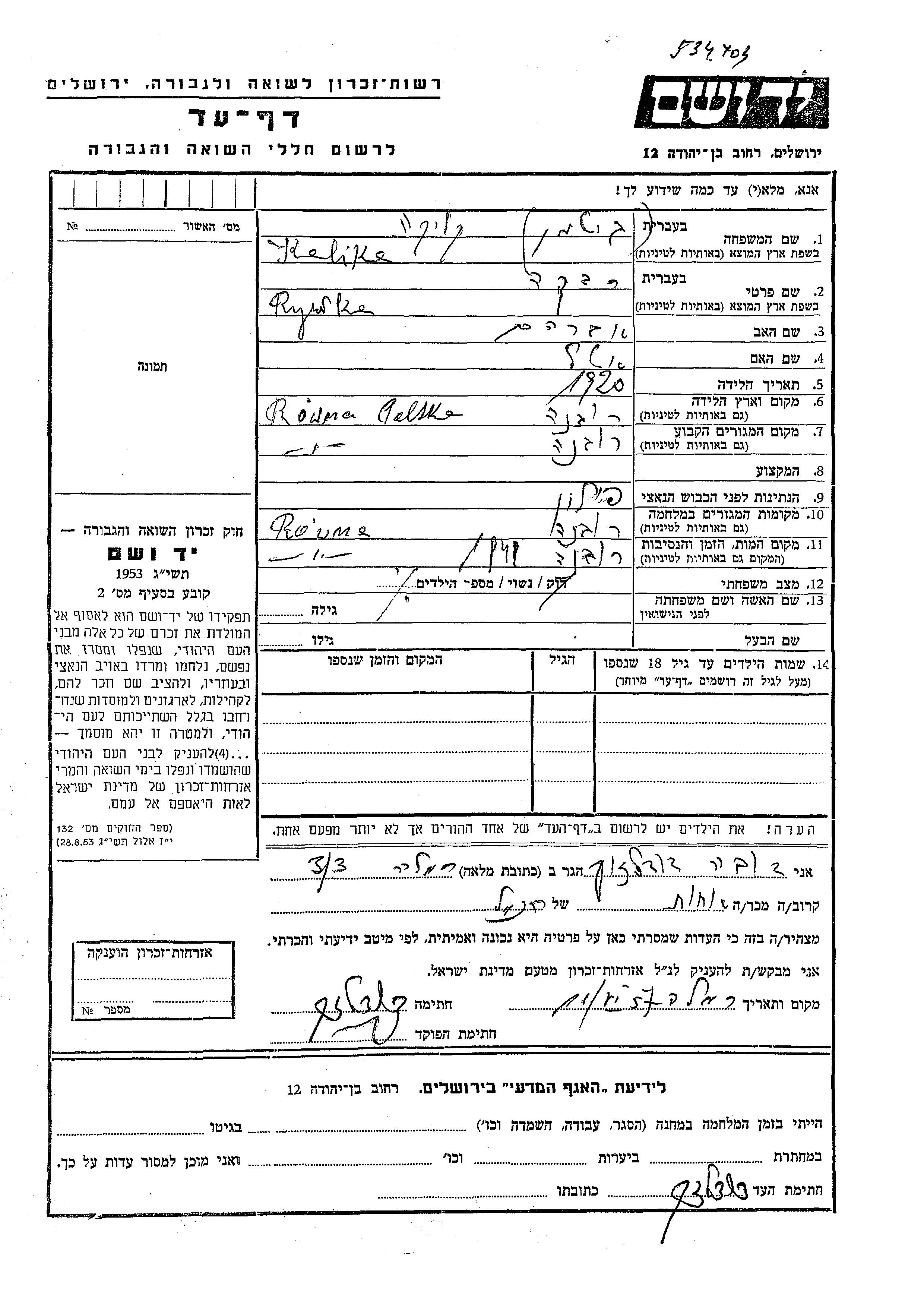 Rywka wurde in der Schoah ermordet. Todesort: Rowne, Polen im Jahr 1941.