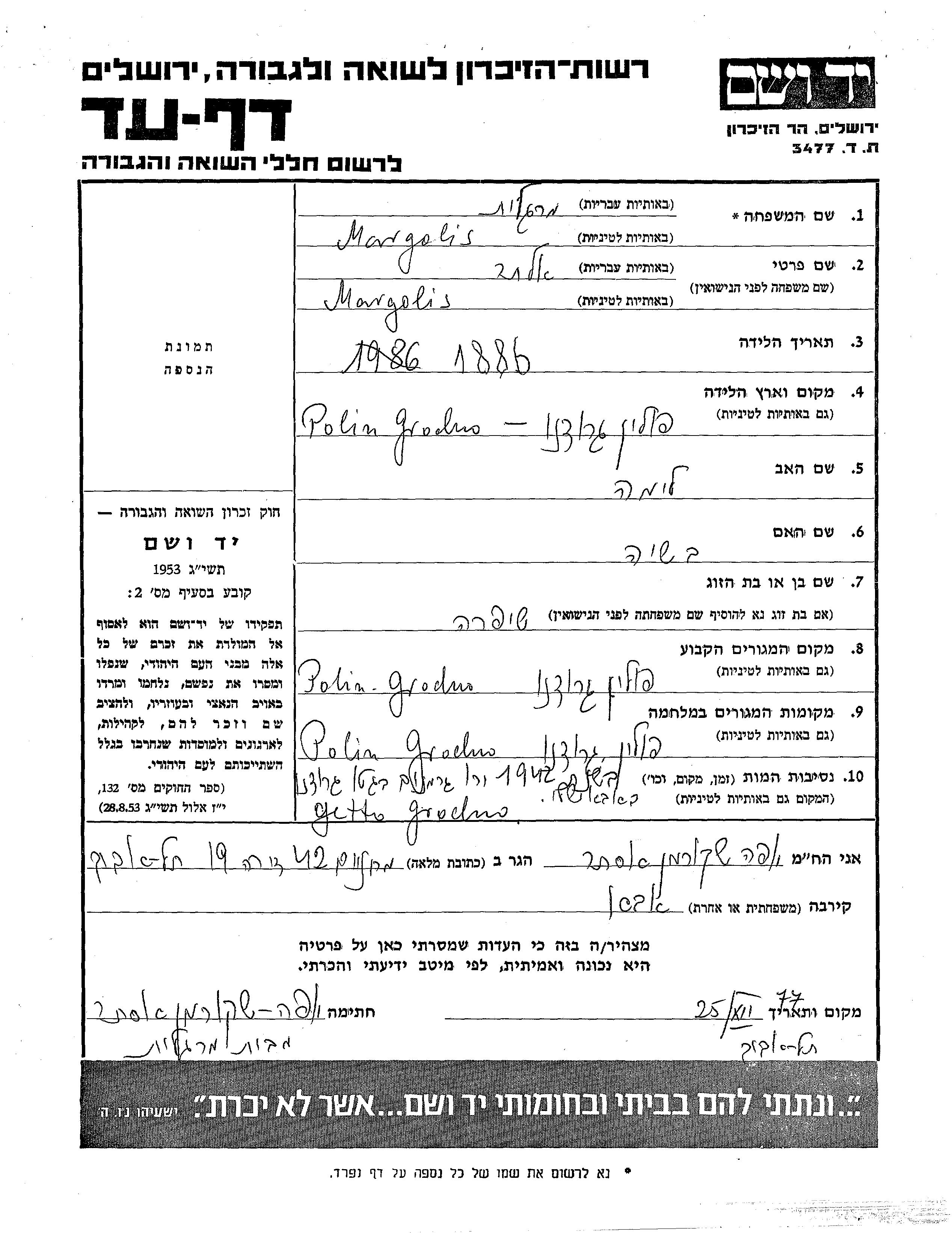 Alter Margalith wurde im Jahr 1886 in Grodno, Polen geboren. Er war der Sohn von Lima und Basha. Er war mit Shifra Verheiratet. Vor dem Zweiten Weltkrieg lebte er in Grodno, Polen. Während des Krieges war er in Grodno, Polen.