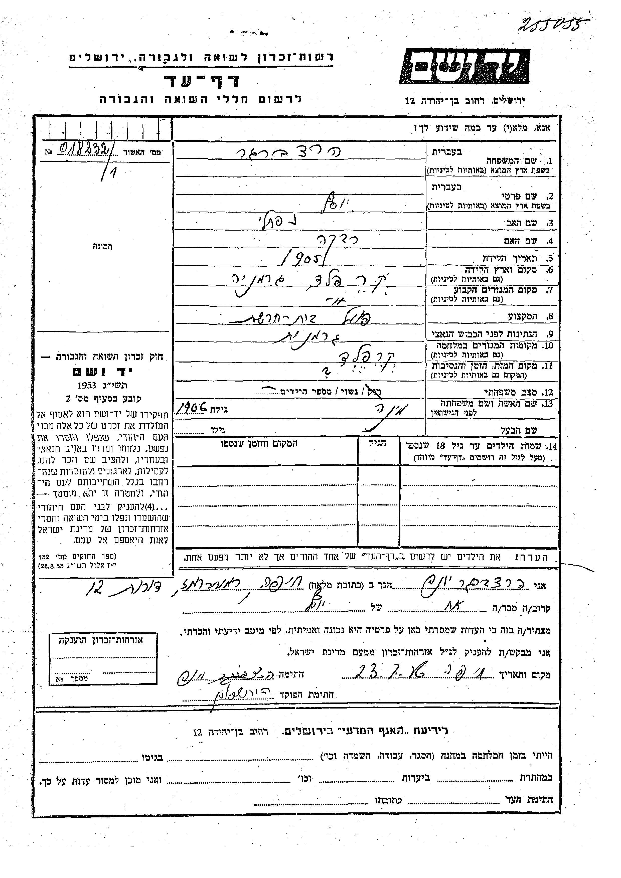 Yosef Hertzberg wurde im Jahr 1905 in Krefeld, Deutsches Reich geboren. Er war der Sohn von Naftali und Rivka. Er war Fabrikarbeiter / fabrikarbeiterin und mit Mina Verheiratet. Vor dem Zweiten Weltkrieg lebte er in Krefeld, Deutsches Reich. Während des Krieges war er in Krefeld, Deutsches Reich.