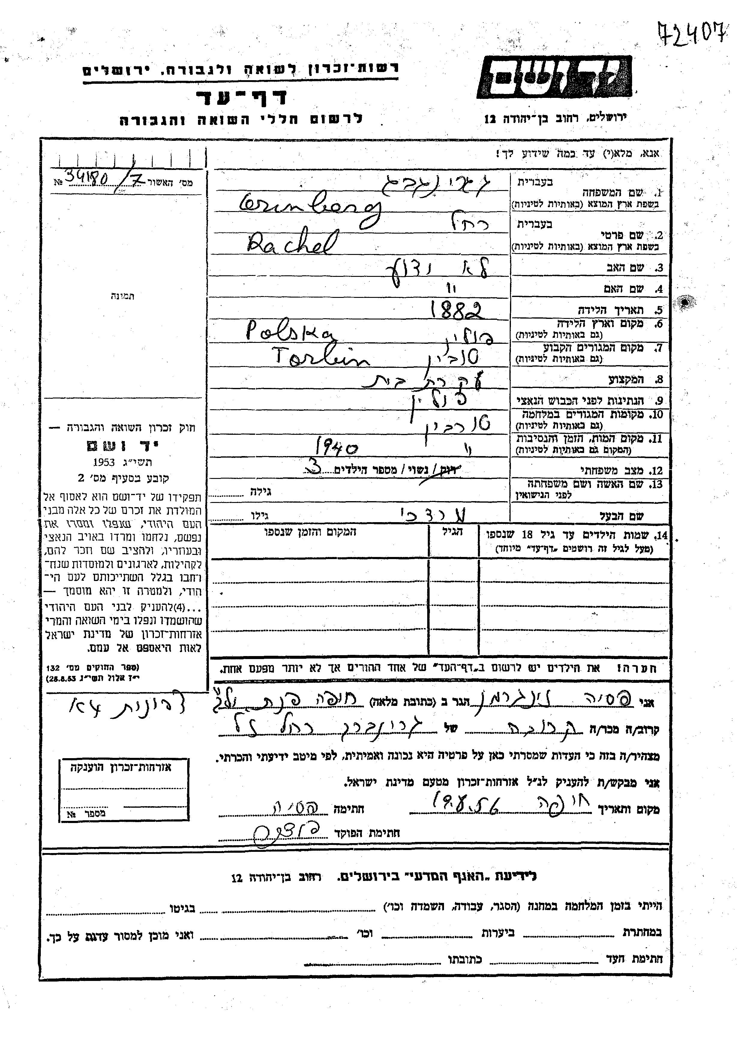 Rachel wurde in der Schoah ermordet. Todesort: Torbin, Polen im Jahr 1940.