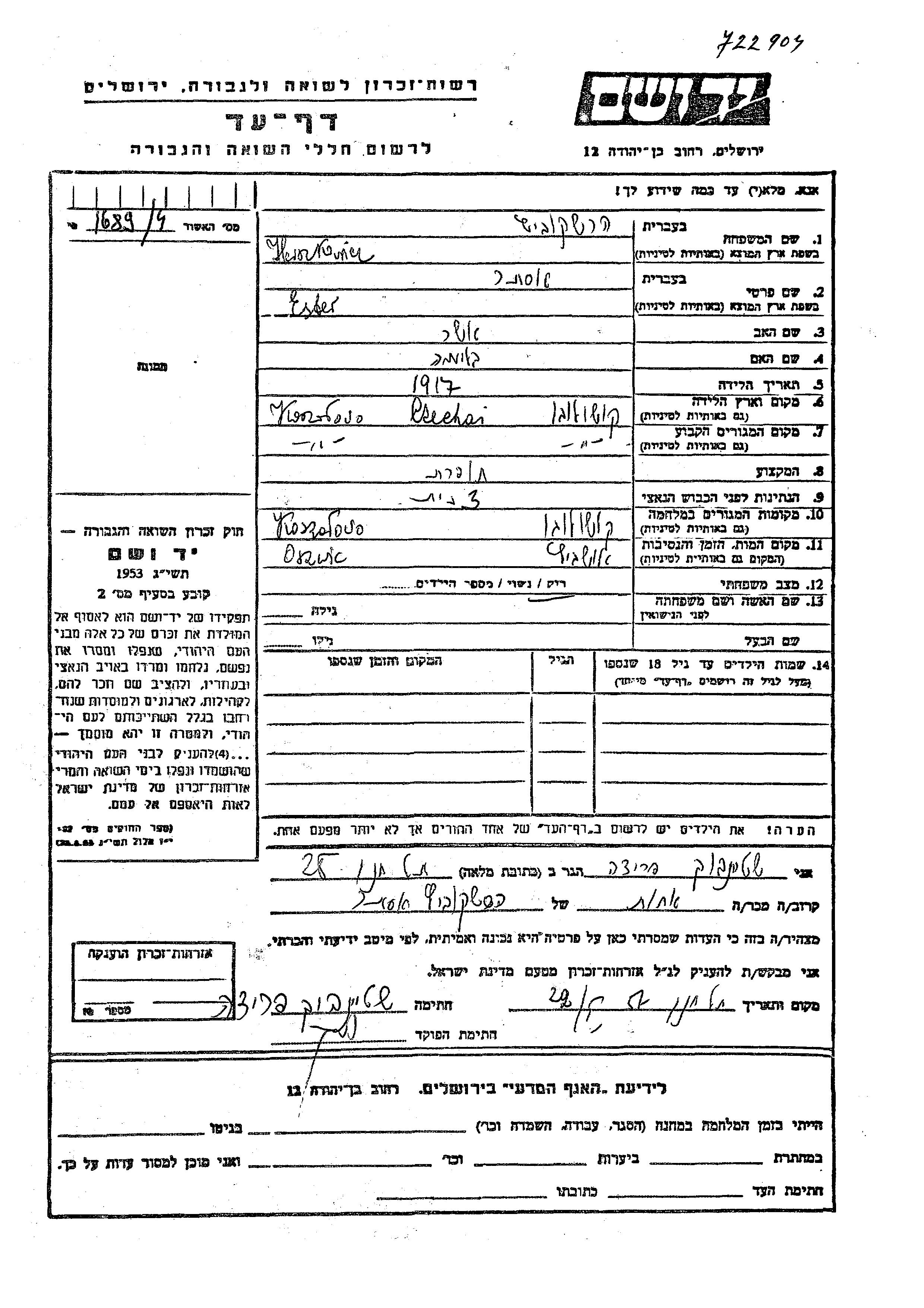 Herszkoviz Ester 1917 Koszolovo, Tschechoslowakei Gedenkblatt