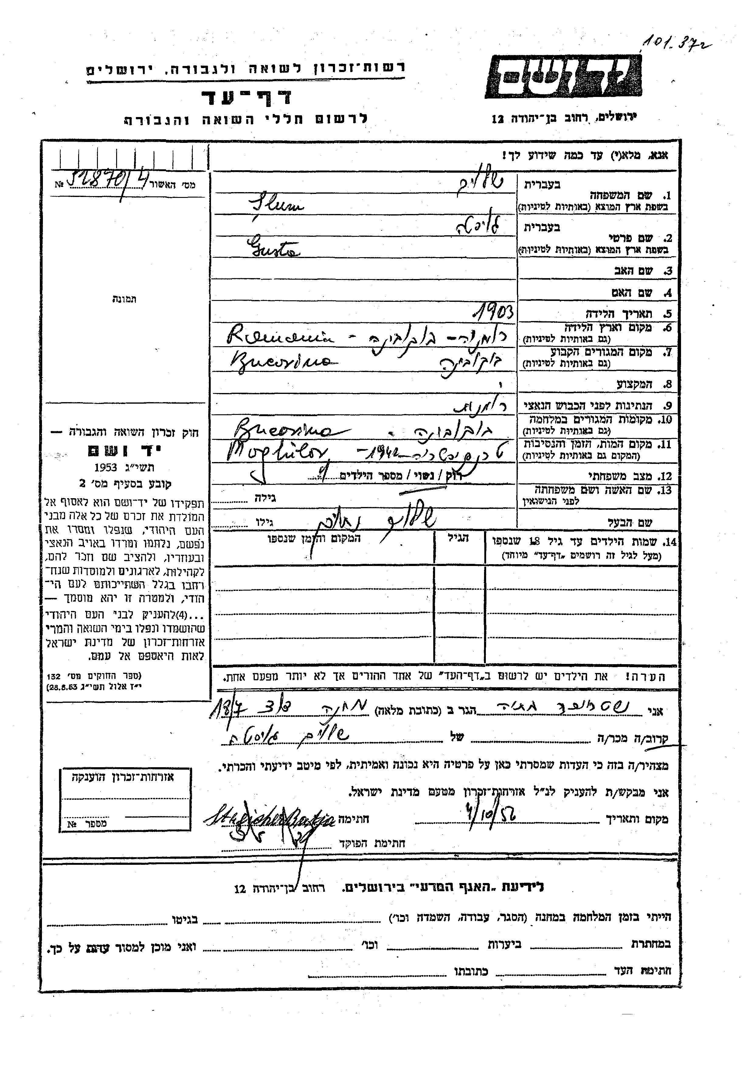 Gusta Slum Shalom wurde im Jahr 1903 in Bukovina, Rumänien geboren. Sie war mit Shalom Nakhum Verheiratet. Vor dem Zweiten Weltkrieg lebte sie in Bukovina, Rumänien. Während des Krieges war sie in Bukovina, Rumänien.