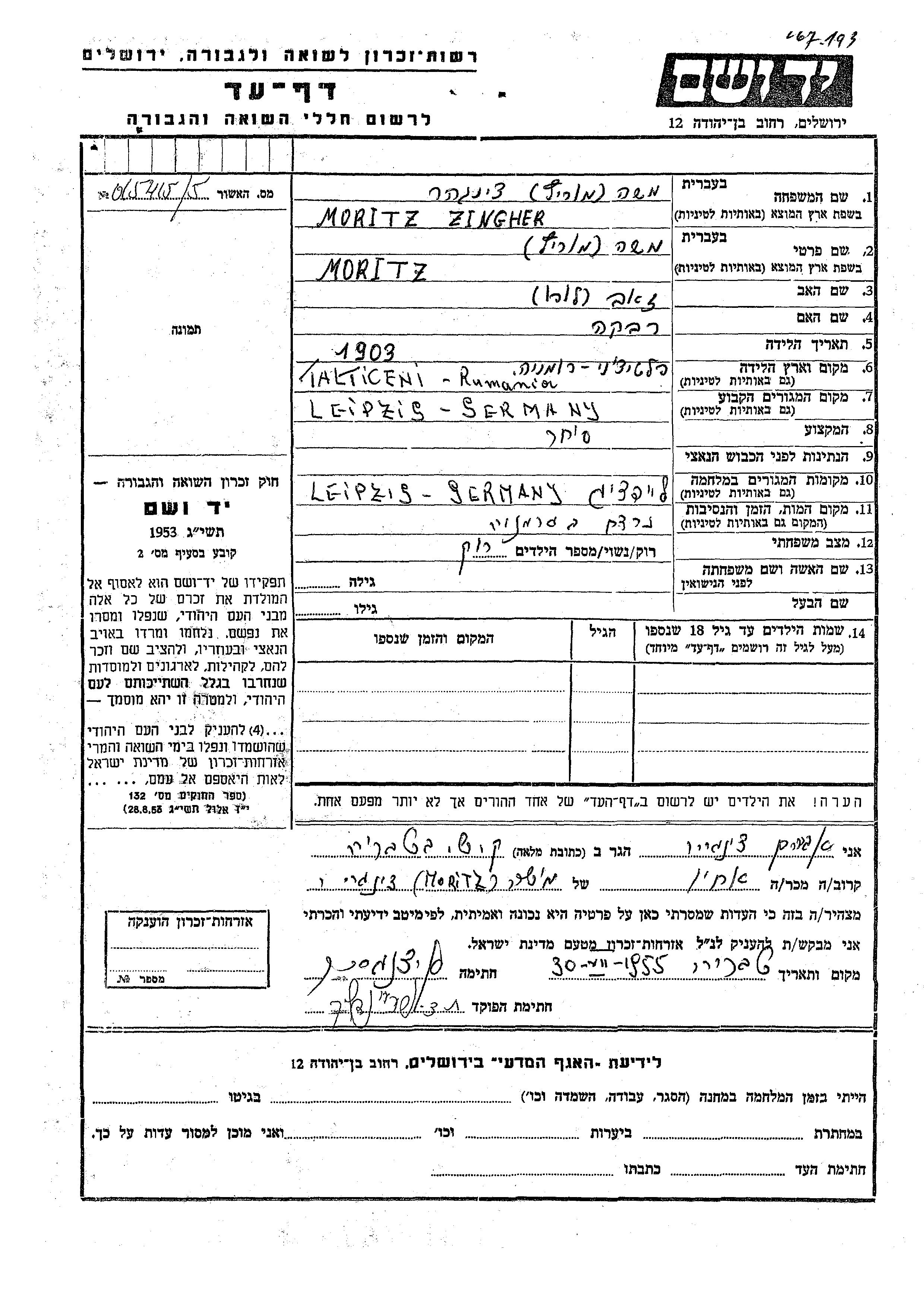 Moshe Moritz Zingher wurde im Jahr 1903 in Falticeni, Rumänien geboren. Er war der Sohn von Zeev Lupu und Rivka. Er war Kaufmann/-frau und Ledig. Vor dem Zweiten Weltkrieg lebte er in Leipzig, Deutsches Reich. Während des Krieges war er in Leipzig, Deutsches Reich.