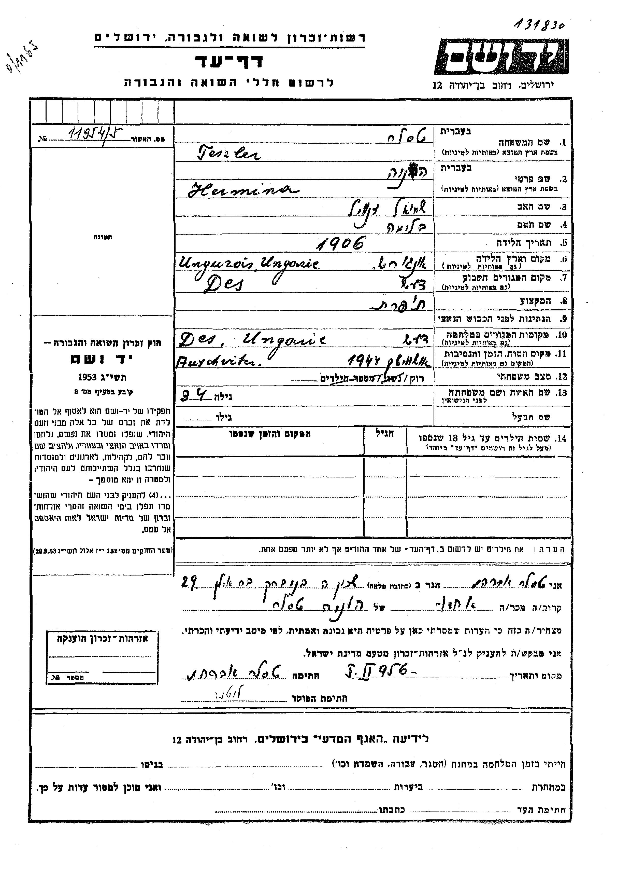 Henia Hermina Teszler wurde im Jahr 1906 in Unguras, Rumänien geboren. Sie war die Tochter von Shmuel und Bluma. Sie war Schneiderin und Ledig. Vor dem Zweiten Weltkrieg lebte sie in Des, Rumänien. Während des Krieges war sie in Des, Rumänien.