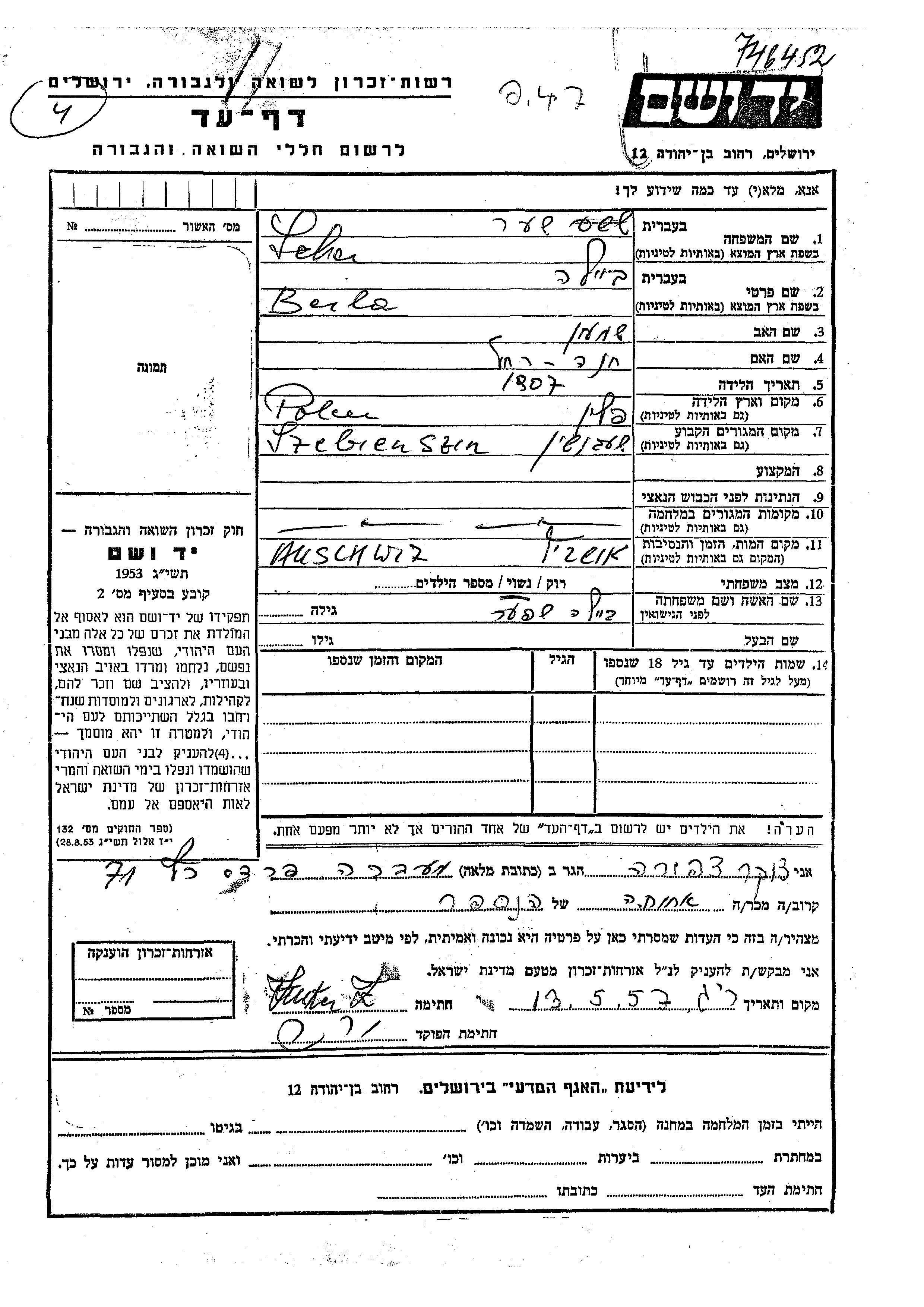 Beila wurde in der Schoah ermordet. Todesort: Auschwitz, Polen.