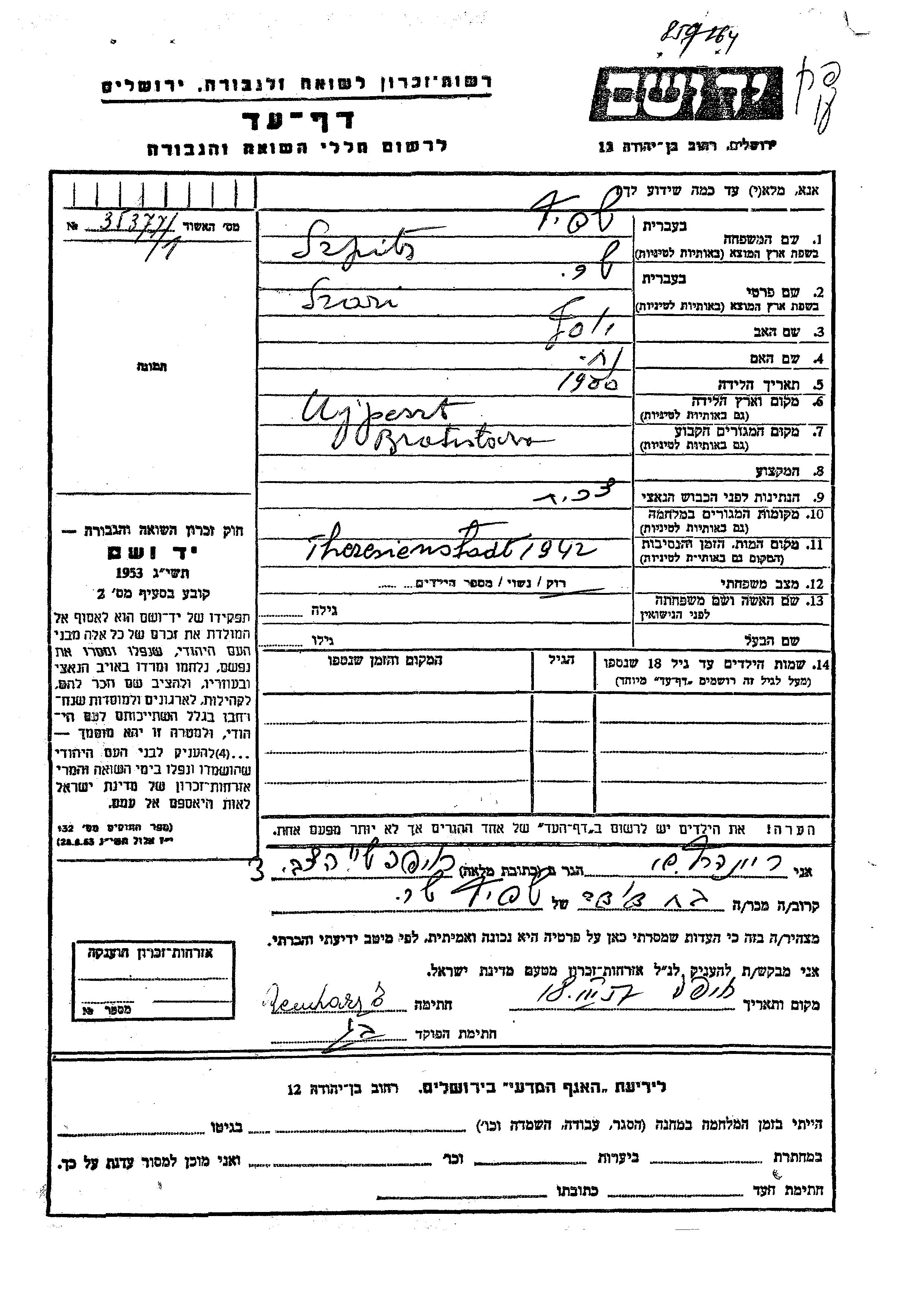 Szari wurde in der Schoah ermordet. Todesort: Theresienstadt, Tschechoslowakei im Jahr 1942.