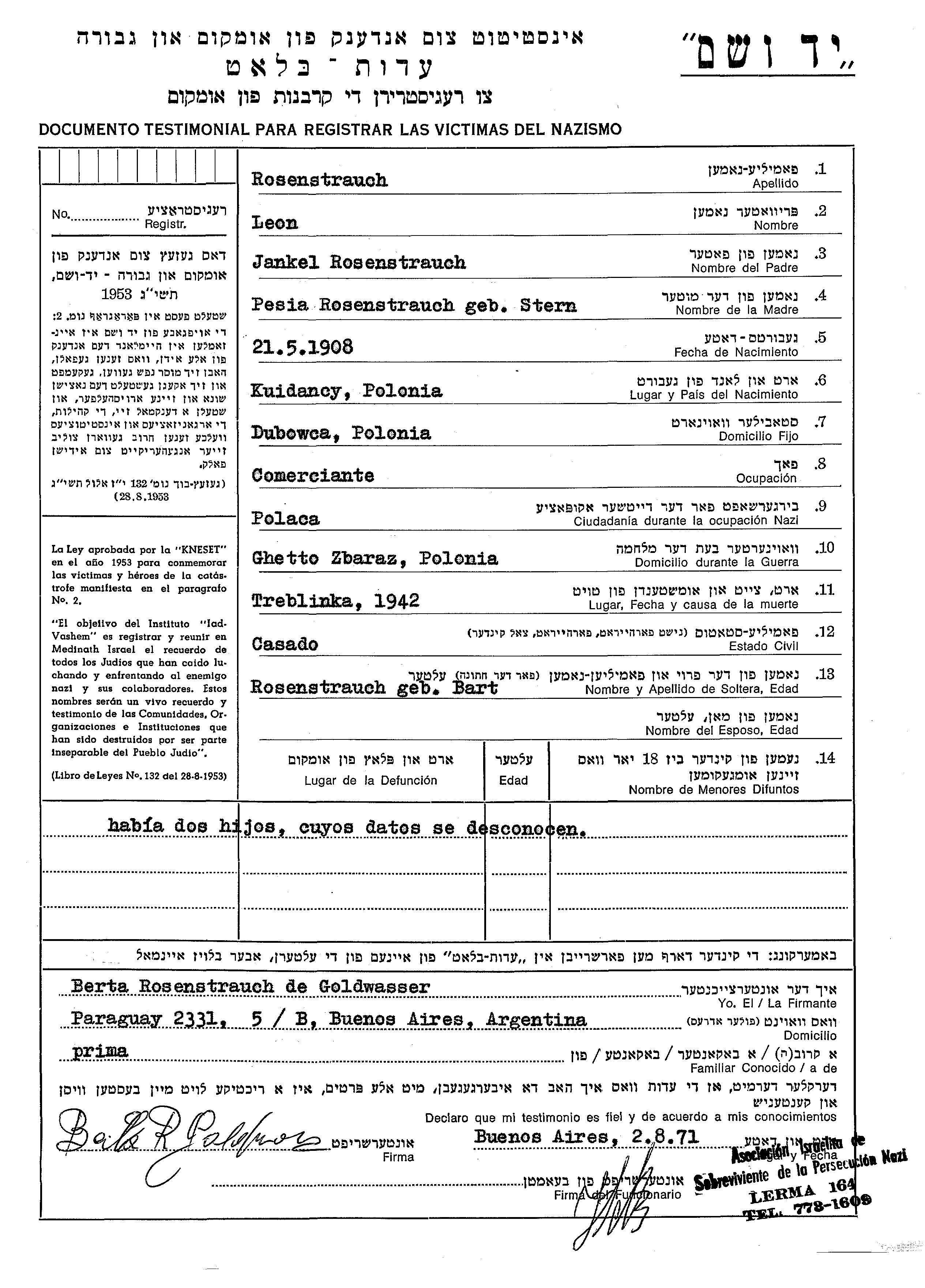 Leon Rosenstrauch wurde im Jahr 1908 in Kuidancy, Polen geboren. Er war der Sohn von Jankel und Pesia, geb. Stern. Er war Kaufmann/-frau und Verheiratet. Vor dem Zweiten Weltkrieg lebte er in Dubowce, Polen. Während des Krieges war er in Zbaraz, Polen.