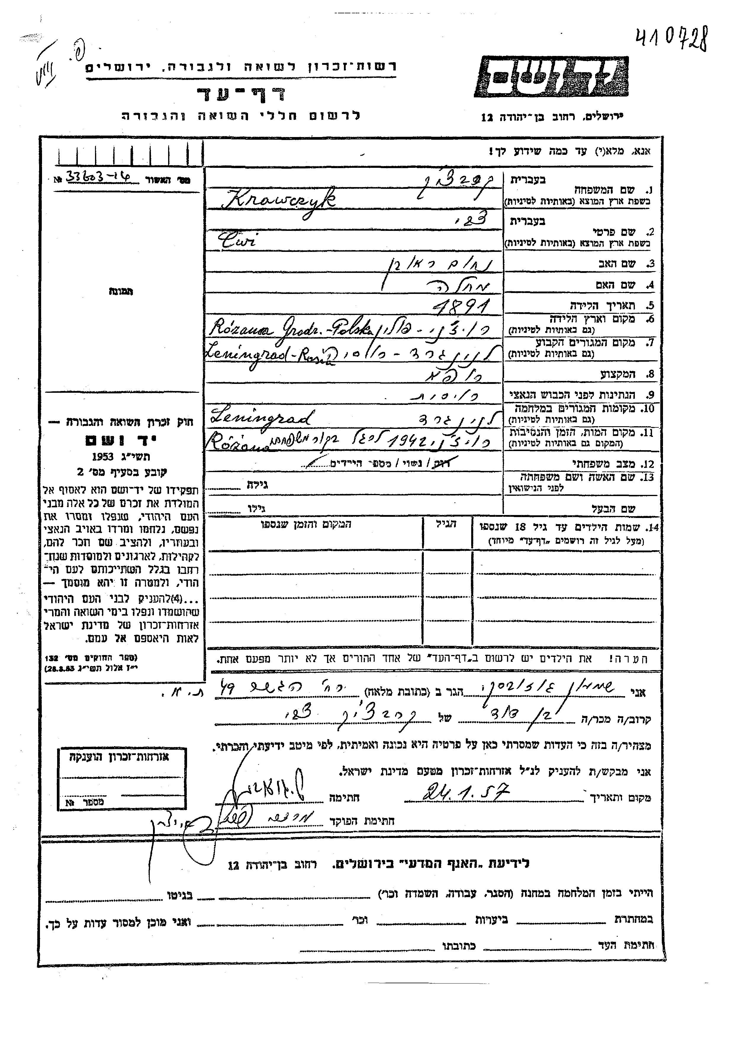 Zwi Krawczyk wurde im Jahr 1891 in Rozana Grodzienska, Polen geboren. Er war der Sohn von Nakhum Reuven und Matla. Er war Arzt/ärztin und Verheiratet. Vor dem Zweiten Weltkrieg lebte er in Leningrad, Russland (UdSSR). Während des Krieges war er in Leningrad, Russland (UdSSR).