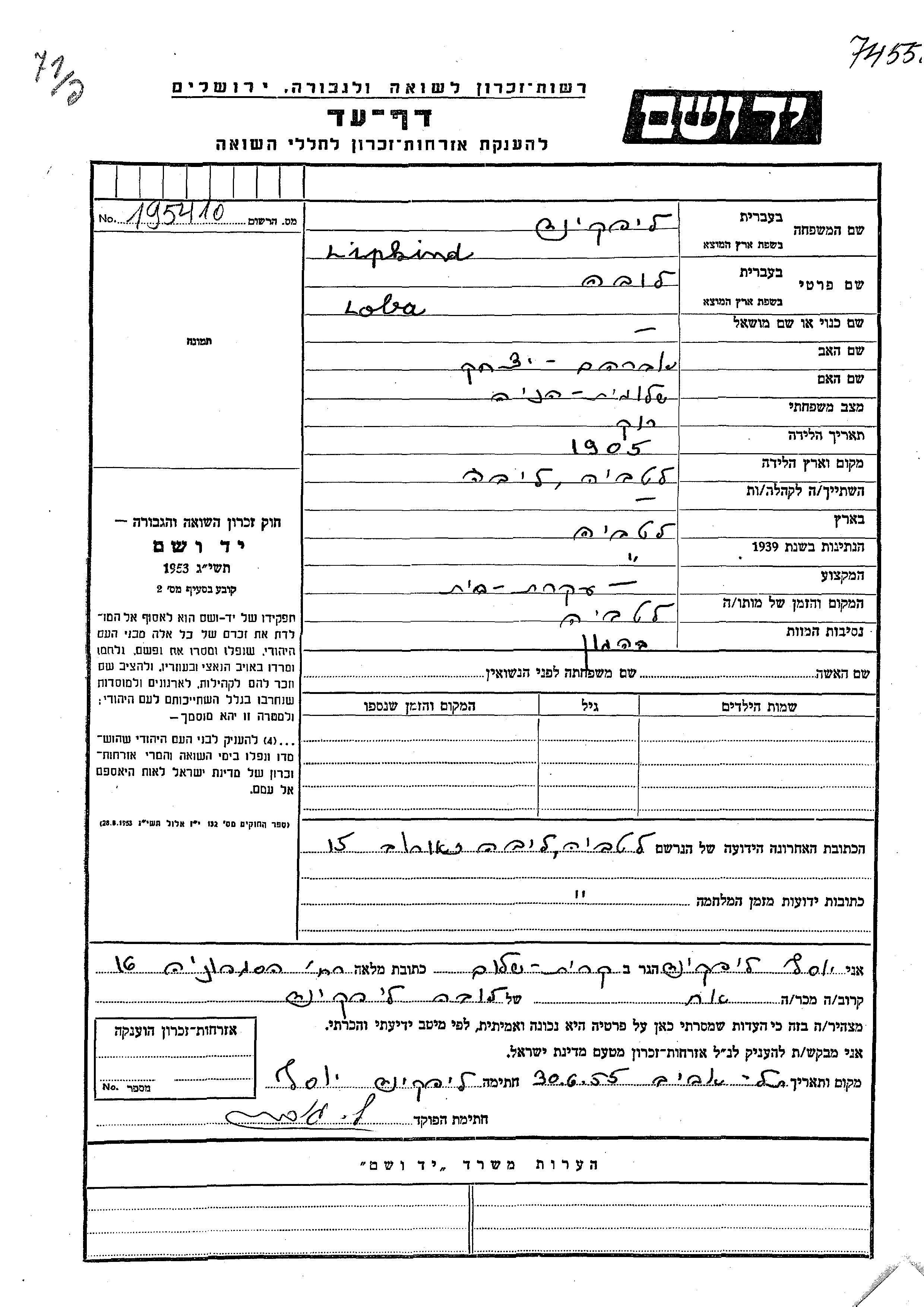 Luba Lipkind wurde im Jahr 1905 in Libau, Lettland geboren. Sie war die Tochter von Avraham Yitzkhak und Shlomit Henia. Sie war Hausfrau und Ledig. Vor dem Zweiten Weltkrieg lebte sie in Libau, Lettland. Während des Krieges war sie in Libau, Lettland.