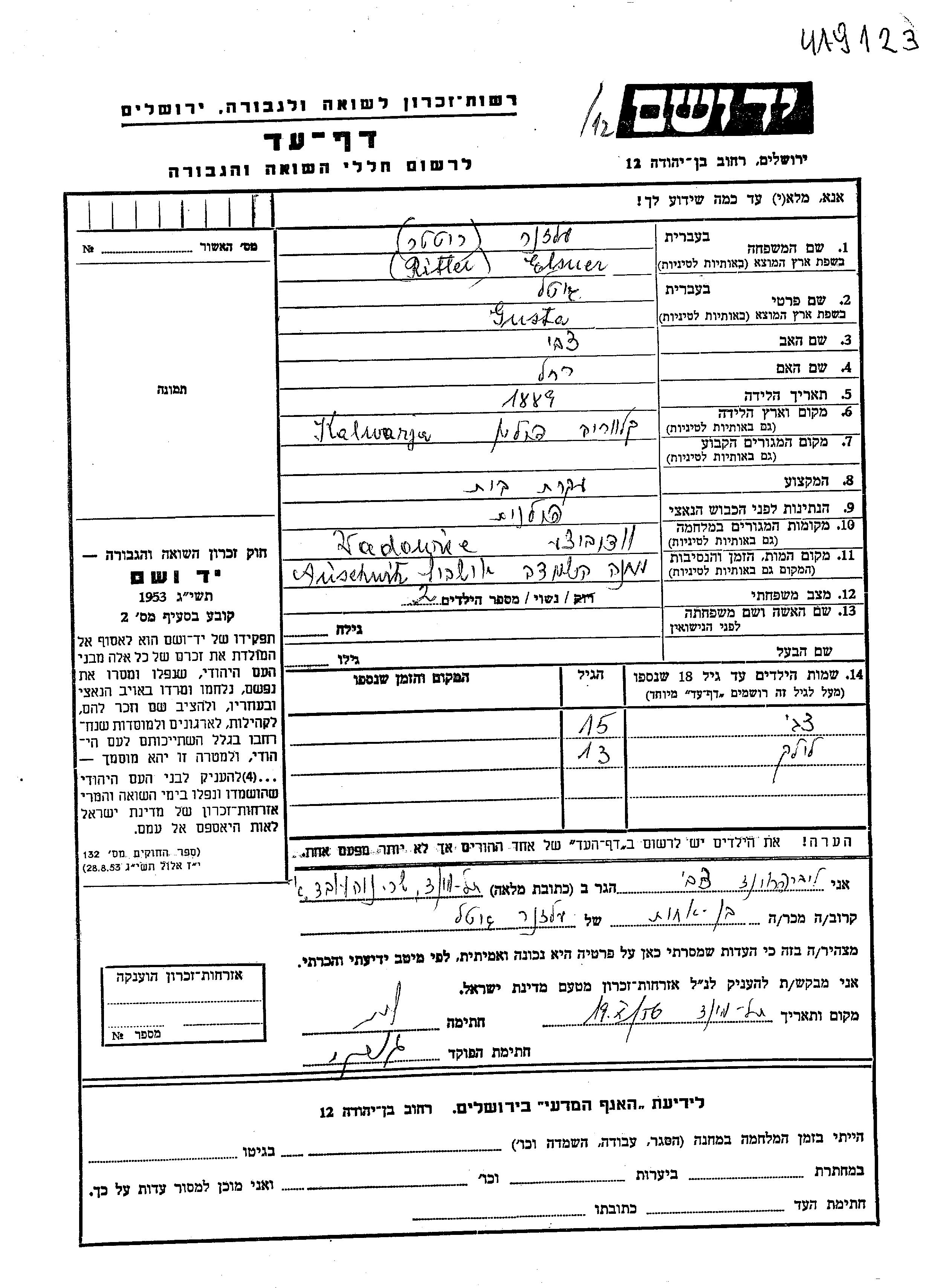 Gusta Gittel Elzner Elsner, geb. Roter wurde im Jahr 1889 in Kalwaria, Polen geboren. Sie war die Tochter von Tzvi und Rakhel. Sie war Hausfrau und Verheiratet. Während des Krieges war sie in Wadowice, Polen.