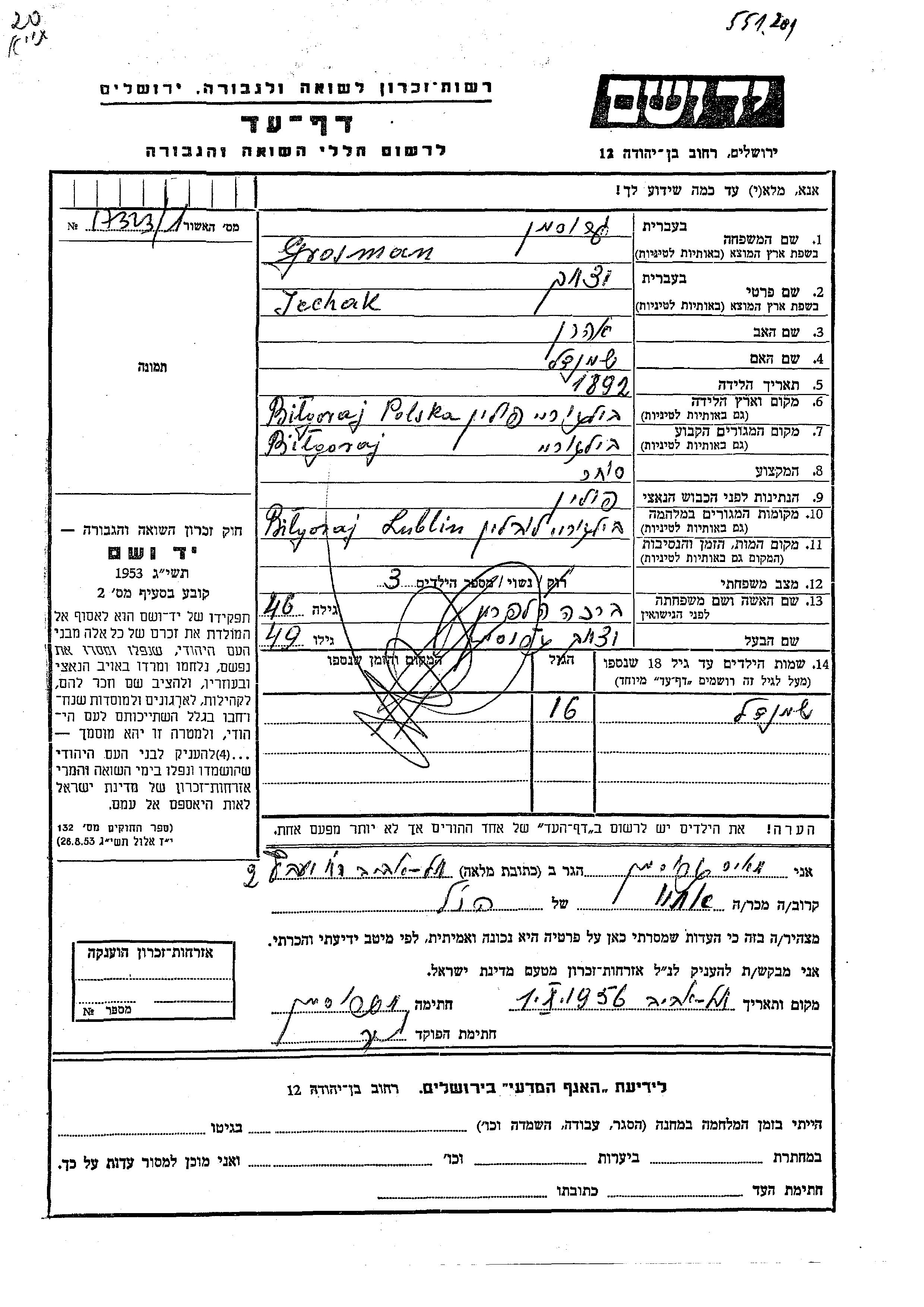 Icchak Grosman wurde im Jahr 1892 geboren. Er war der Sohn von Aharon und Sheindl. Er war Kaufmann/-frau und mit Brakha, geb. Halperin Verheiratet.