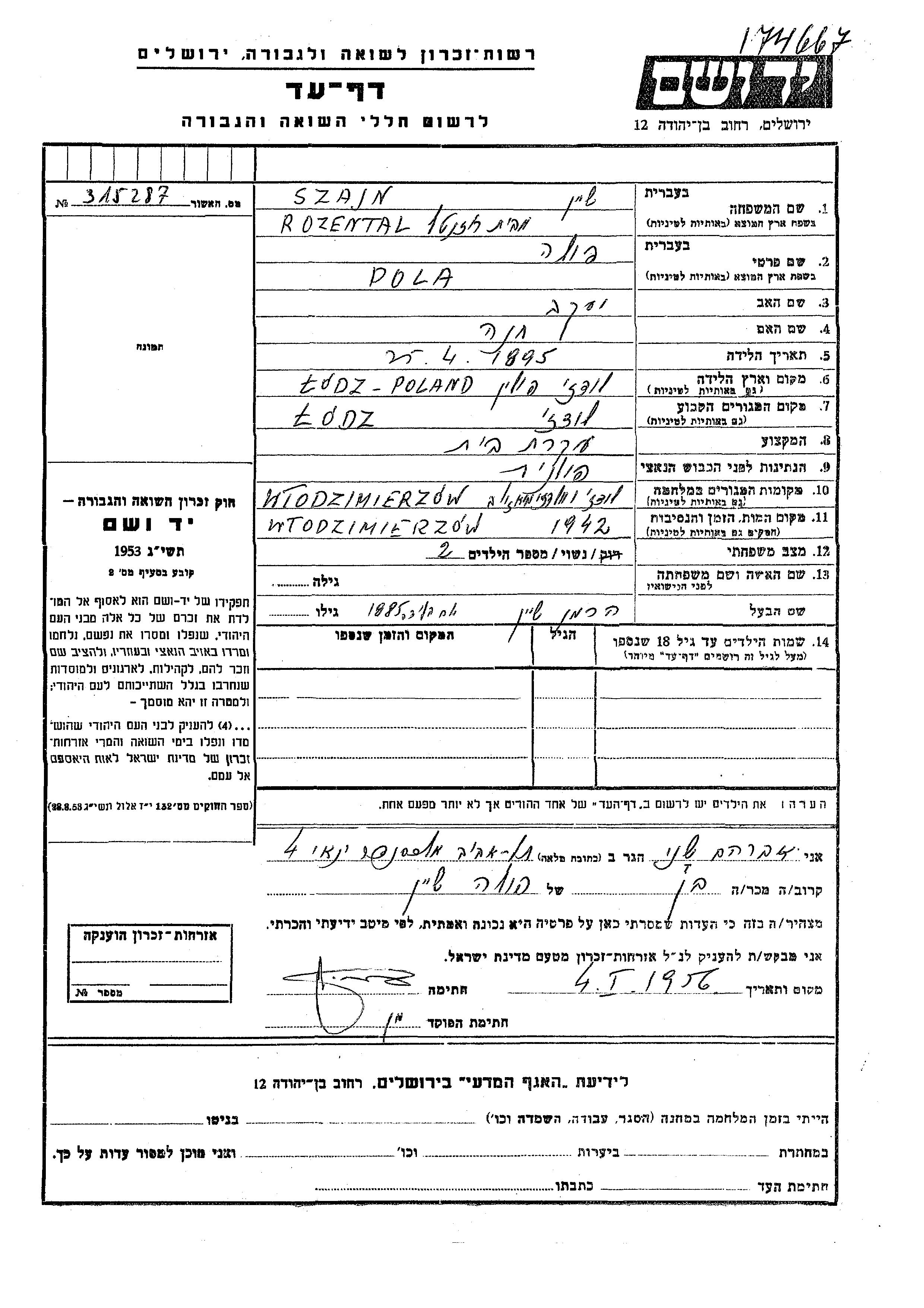 Pola Szajn, geb. Rozental wurde im Jahr 1895 in Lodz, Polen geboren. Sie war die Tochter von Yaakov und Khana. Sie war Hausfrau und mit Herman Verheiratet. Vor dem Zweiten Weltkrieg lebte sie in Lodz, Polen. Während des Krieges war sie in Wlodzimierz, Polen.