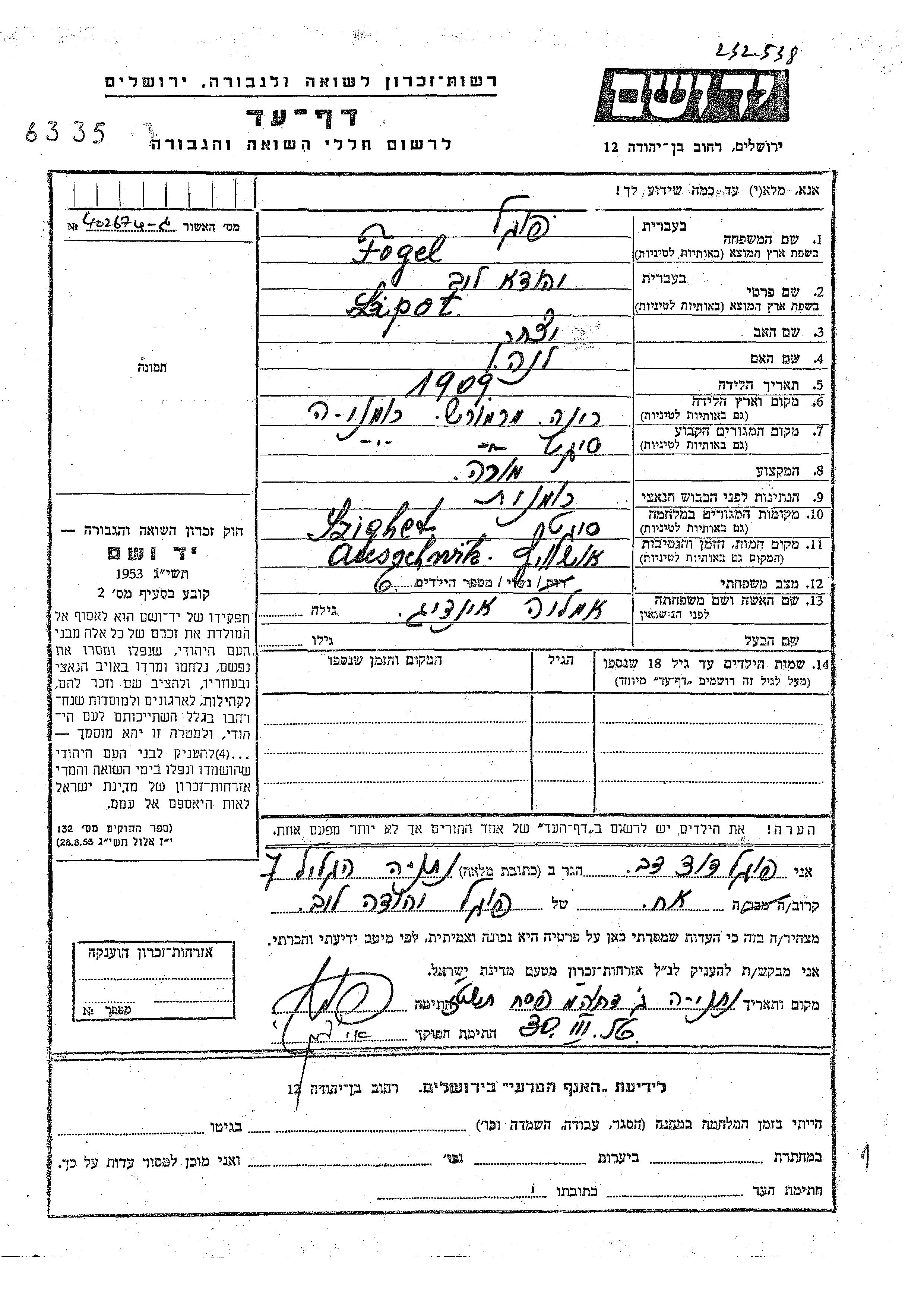 Yehuda Lob Lipot Fogel wurde im Jahr 1909 in Rona, Rumänien geboren. Er war der Sohn von Yitzkhak und Lena. Er war Lehrer/in und mit Amalia, geb. Untzig Verheiratet. Vor dem Zweiten Weltkrieg lebte er in Sighet, Rumänien. Während des Krieges war er in Sighet, Rumänien.