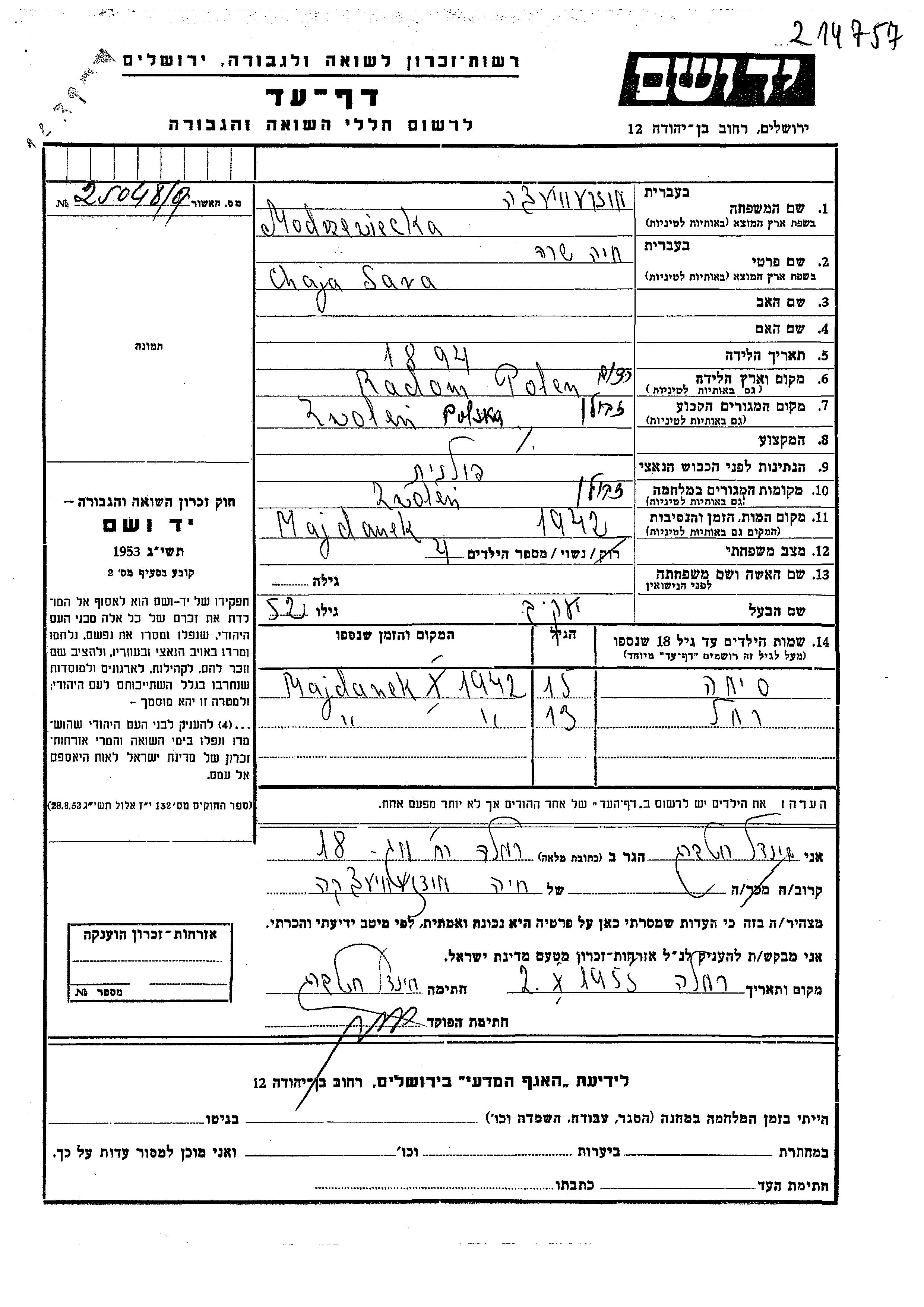 Chaja Sara Modrzewiecka wurde im Jahr 1894 in Radom, Polen geboren. Sie war mit Yaakov Verheiratet. Vor dem Zweiten Weltkrieg lebte sie in Zvolin, Polen. Während des Krieges war sie in Zvolin, Polen.
