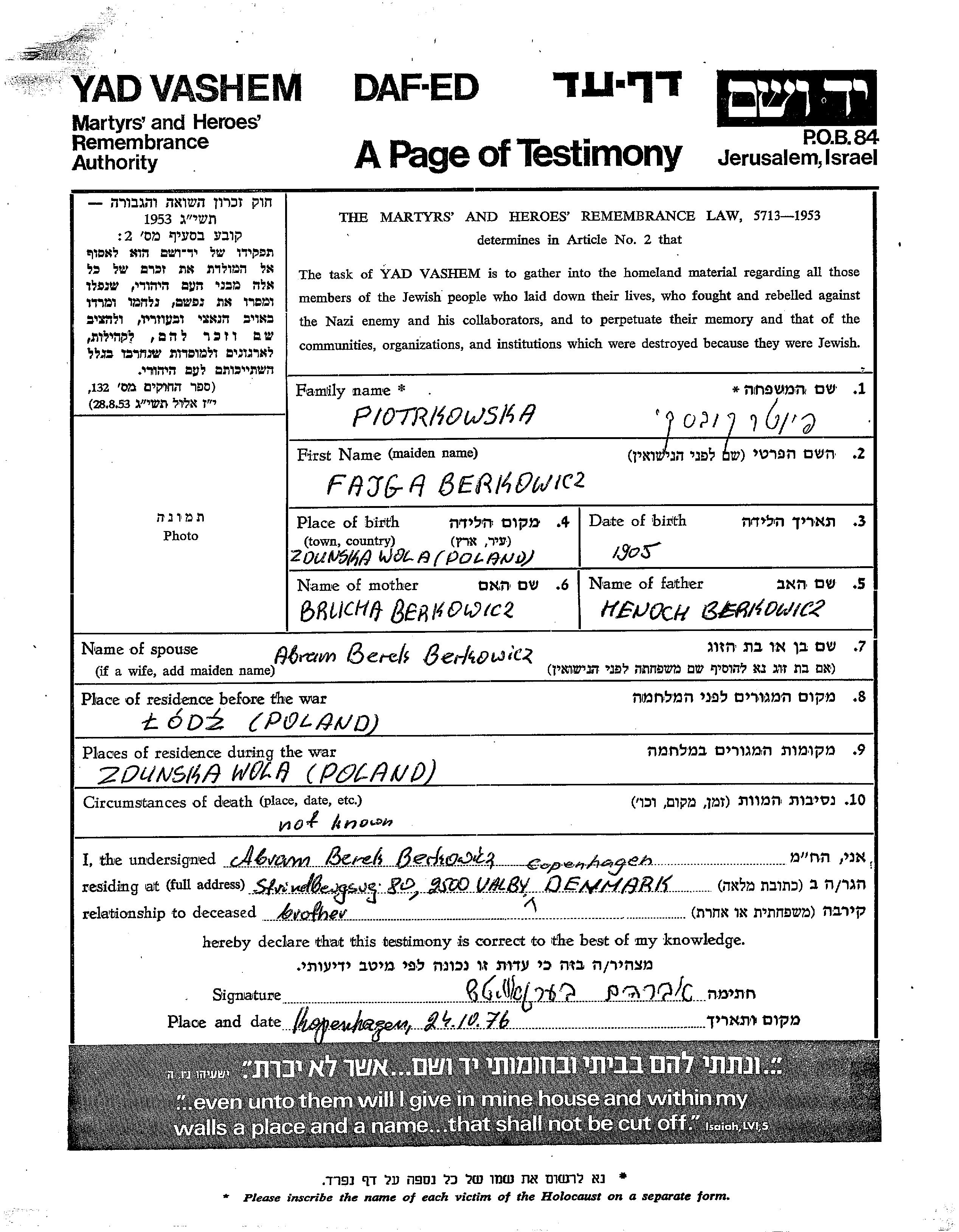 Fajga Piotrkowska, geb. Berkowicz wurde im Jahr 1905 in Zdunska Wola, Polen geboren. Sie war die Tochter von Henoch und Brucha. Vor dem Zweiten Weltkrieg lebte sie in Lodz, Polen. Während des Krieges war sie in Zdunska Wola, Polen.