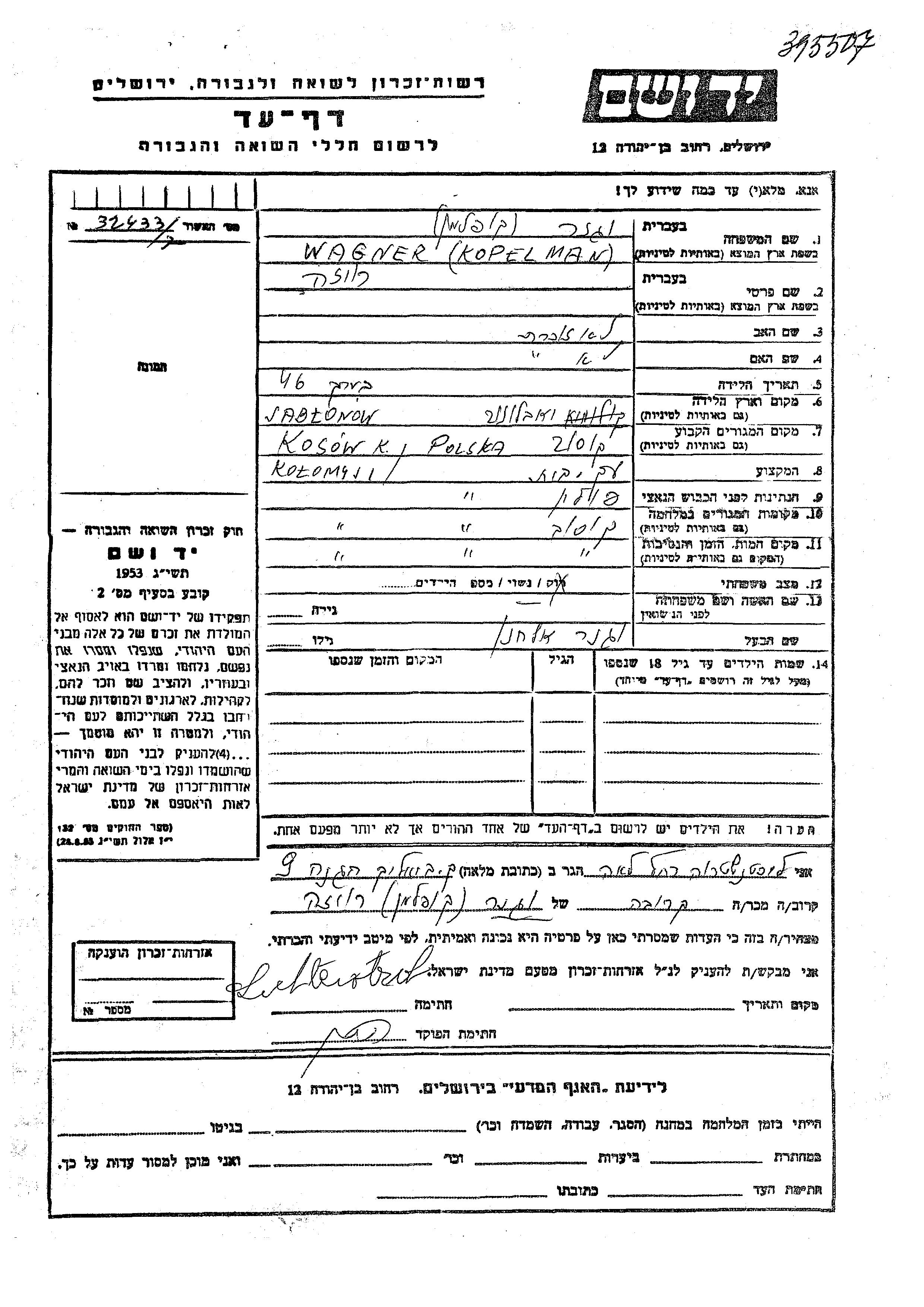 Roiza Wagner, geb. Kopelman wurde in Jablonow, Polen geboren. Sie war Hausfrau und mit Elkhanan Verheiratet. Vor dem Zweiten Weltkrieg lebte sie in Kosow, Polen. Während des Krieges war sie in Kosow, Polen.