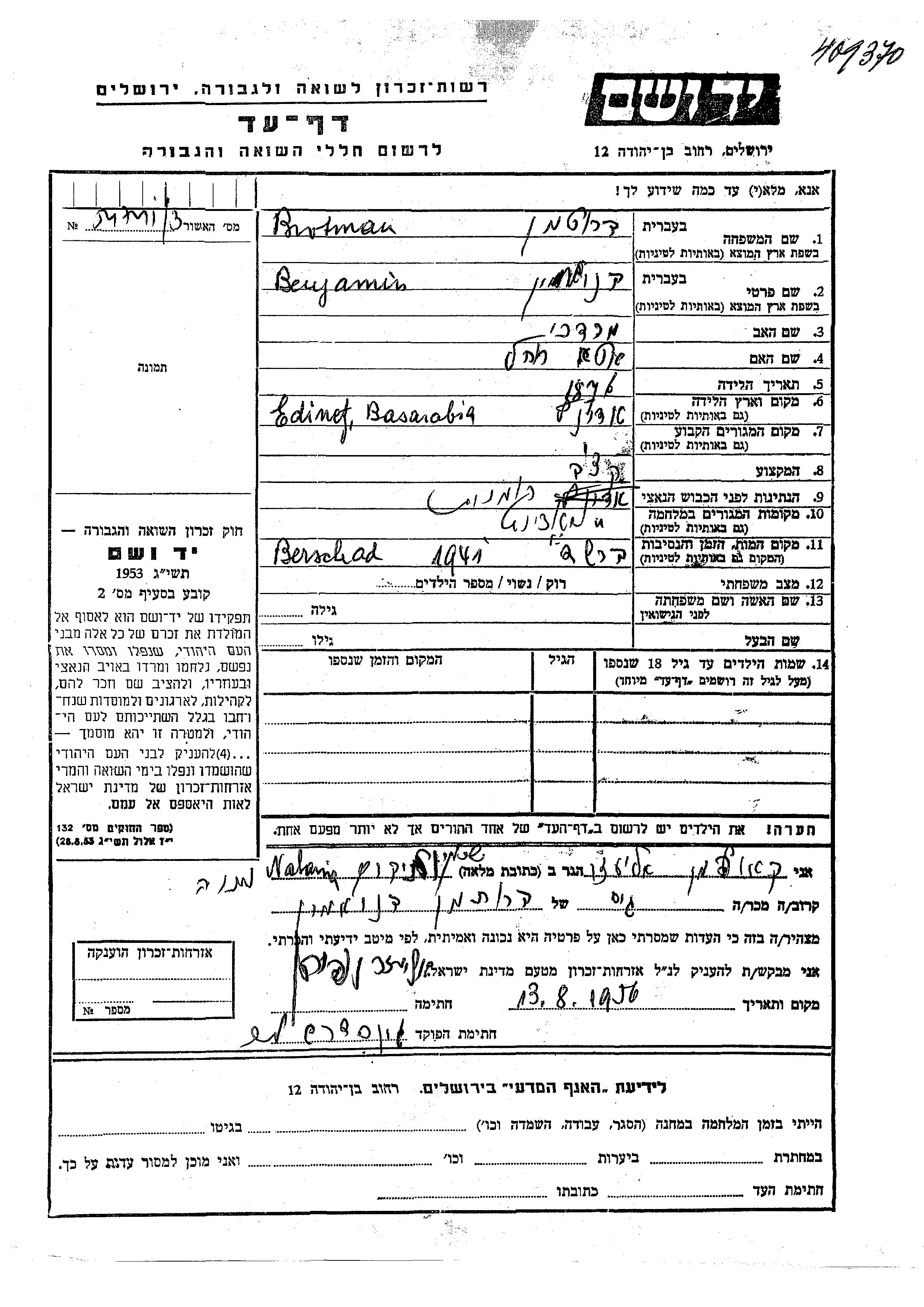 Benjamin wurde in der Schoah ermordet. Todesort: Berschad, Ukraine (UdSSR) im Jahr 1941.