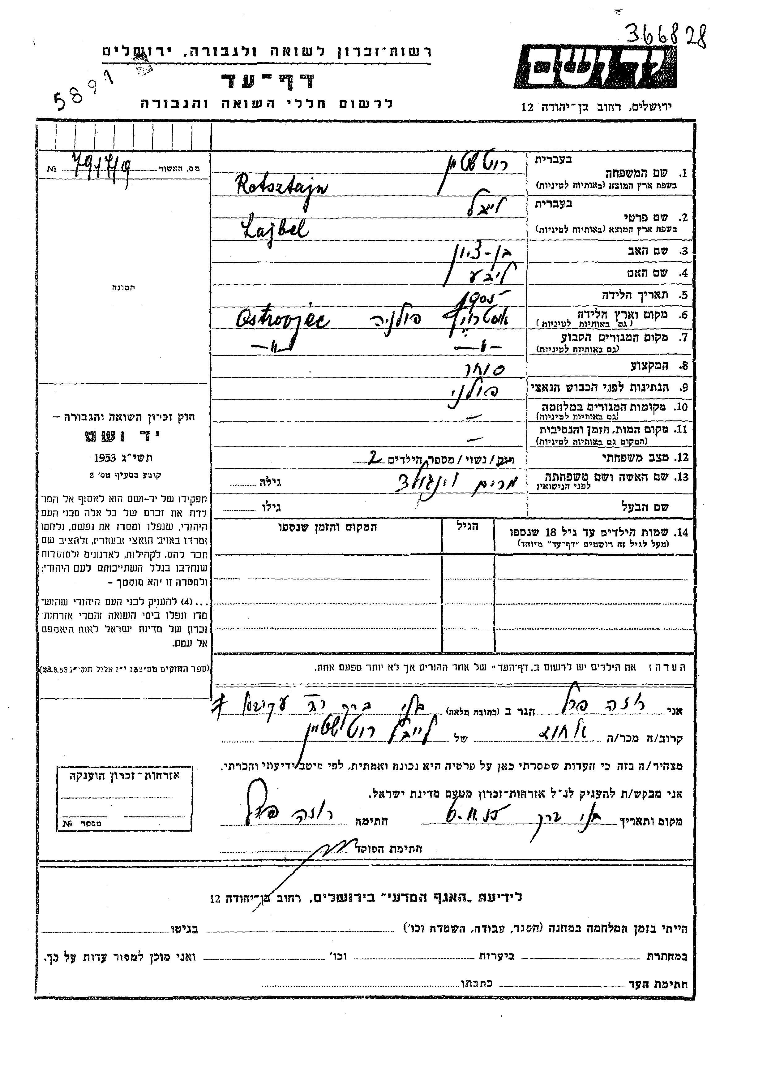 Lajbel Rotsztajn wurde im Jahr 1905 in Ostrowiec, Polen geboren. Er war der Sohn von Bentzion und Libe. Er war Kaufmann/-frau und mit Miriam, geb. Veingold Verheiratet. Vor dem Zweiten Weltkrieg lebte er in Ostrowiec, Polen.
