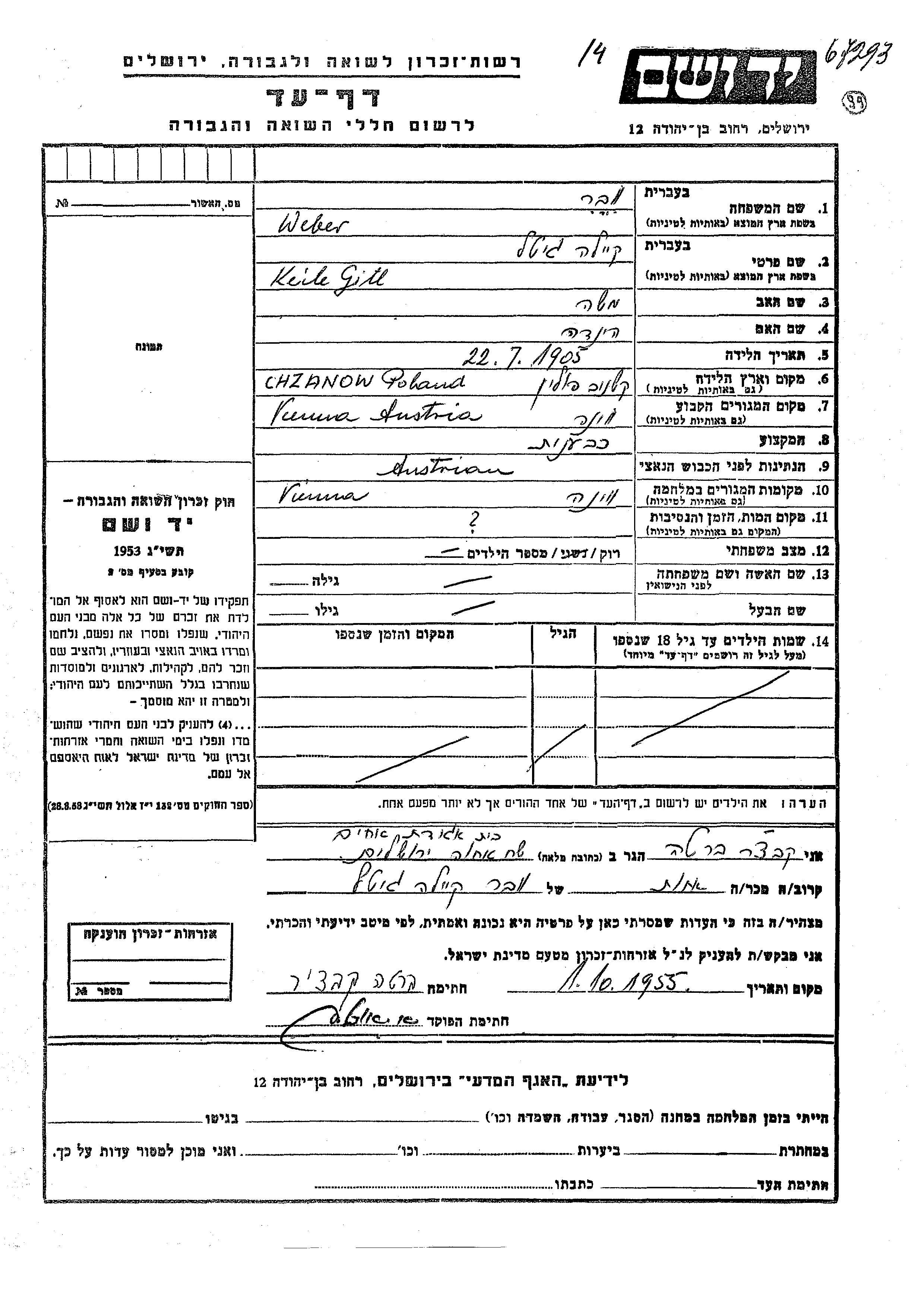 Keila Gitl Weber Vaver wurde im Jahr 1905 in Chzanow, Polen geboren. Sie war die Tochter von Moshe und Hinda. Sie war Hutmacher/-in und Ledig. Vor dem Zweiten Weltkrieg lebte sie in Vienna, Österreich. Während des Krieges war sie in Vienna, Österreich.