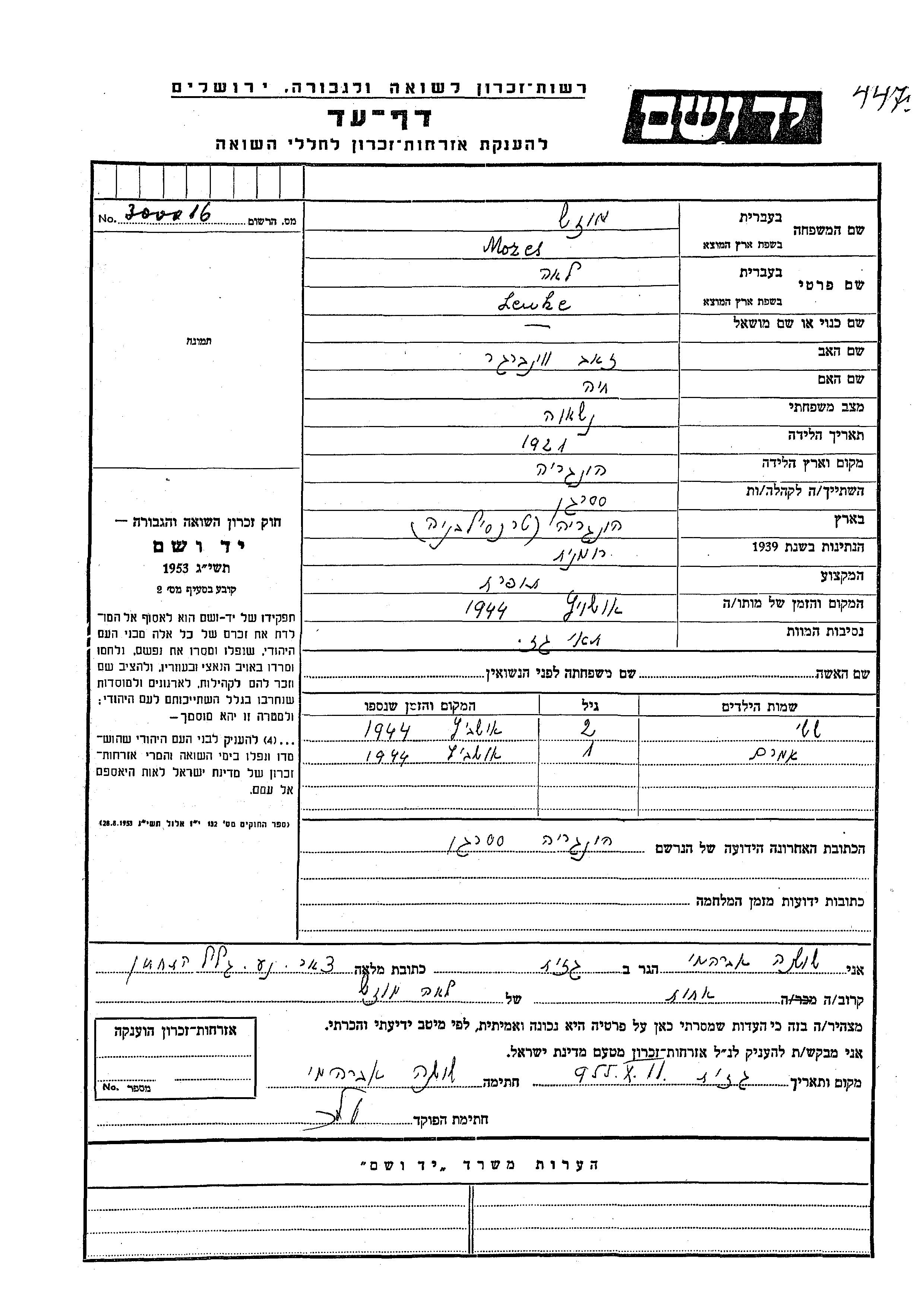 Leuhe Mozes, geb. Vinberger wurde im Jahr 1921 in Ungarn geboren. Sie war die Tochter von Zeev und Khaia. Sie war Schneiderin und Verheiratet. Vor dem Zweiten Weltkrieg lebte sie in Reghin Sat, Rumänien. Während des Krieges war sie in Reghin Sat, Rumänien.