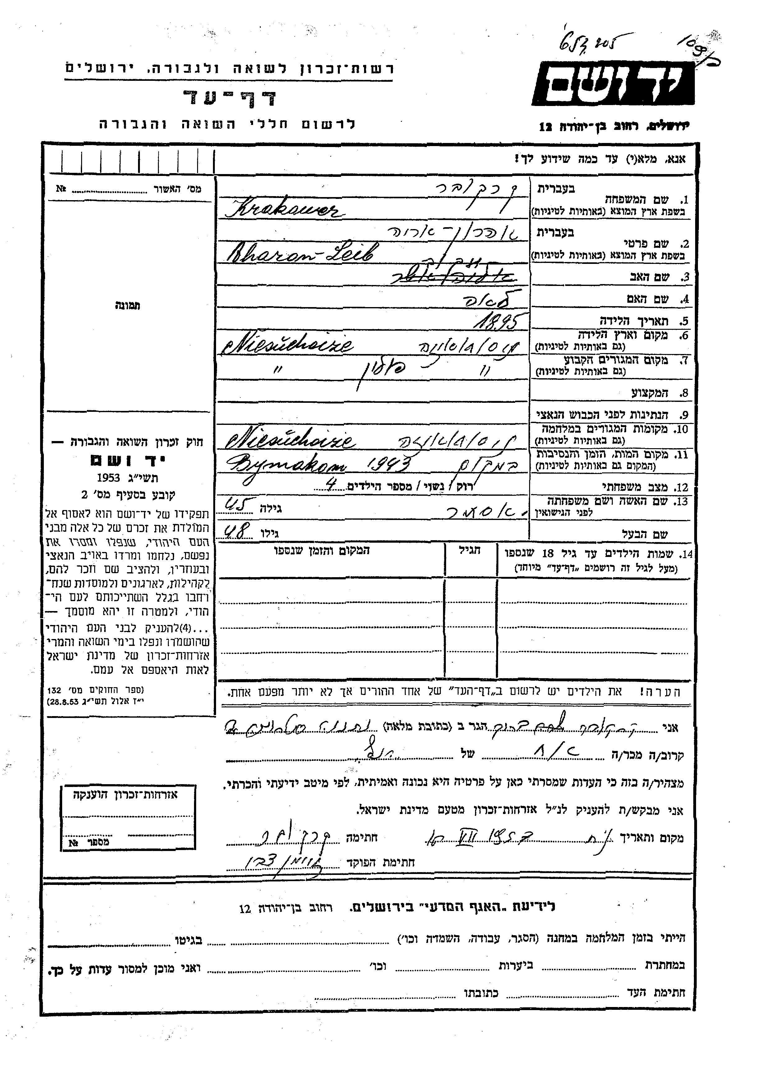 Aharon Arie Leib wurde in der Schoah ermordet. Todesort: Niesuchaize, Polen im Jahr 1943.