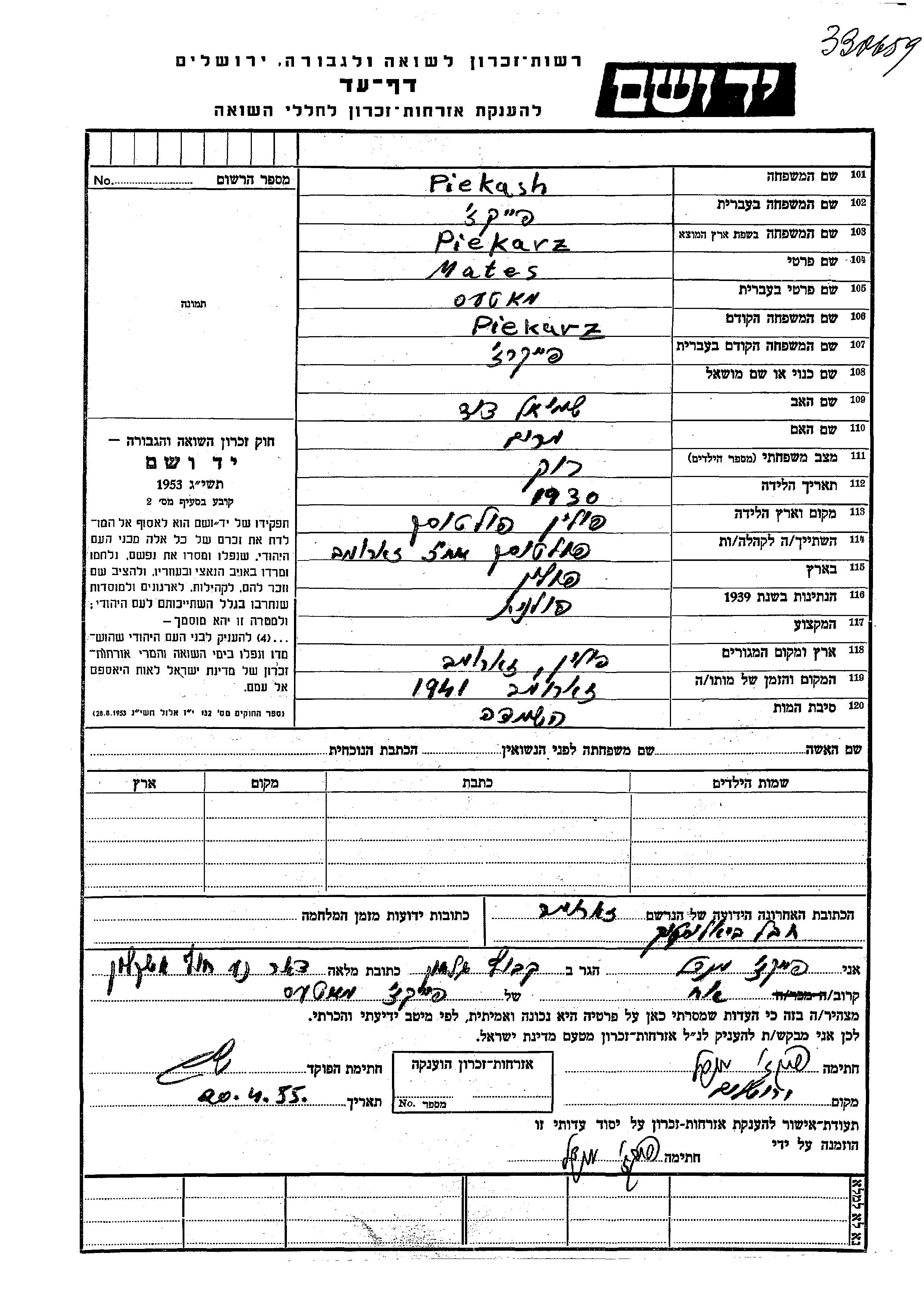 Mates Piekarz wurde im Jahr 1930 in Pultusk, Polen geboren. Er war der Sohn von Shmuel David und Miriam. Er war Ledig. Vor dem Zweiten Weltkrieg lebte er in Zareby Koscielne, Polen. Während des Krieges war er in Zareby Koscielne, Polen.