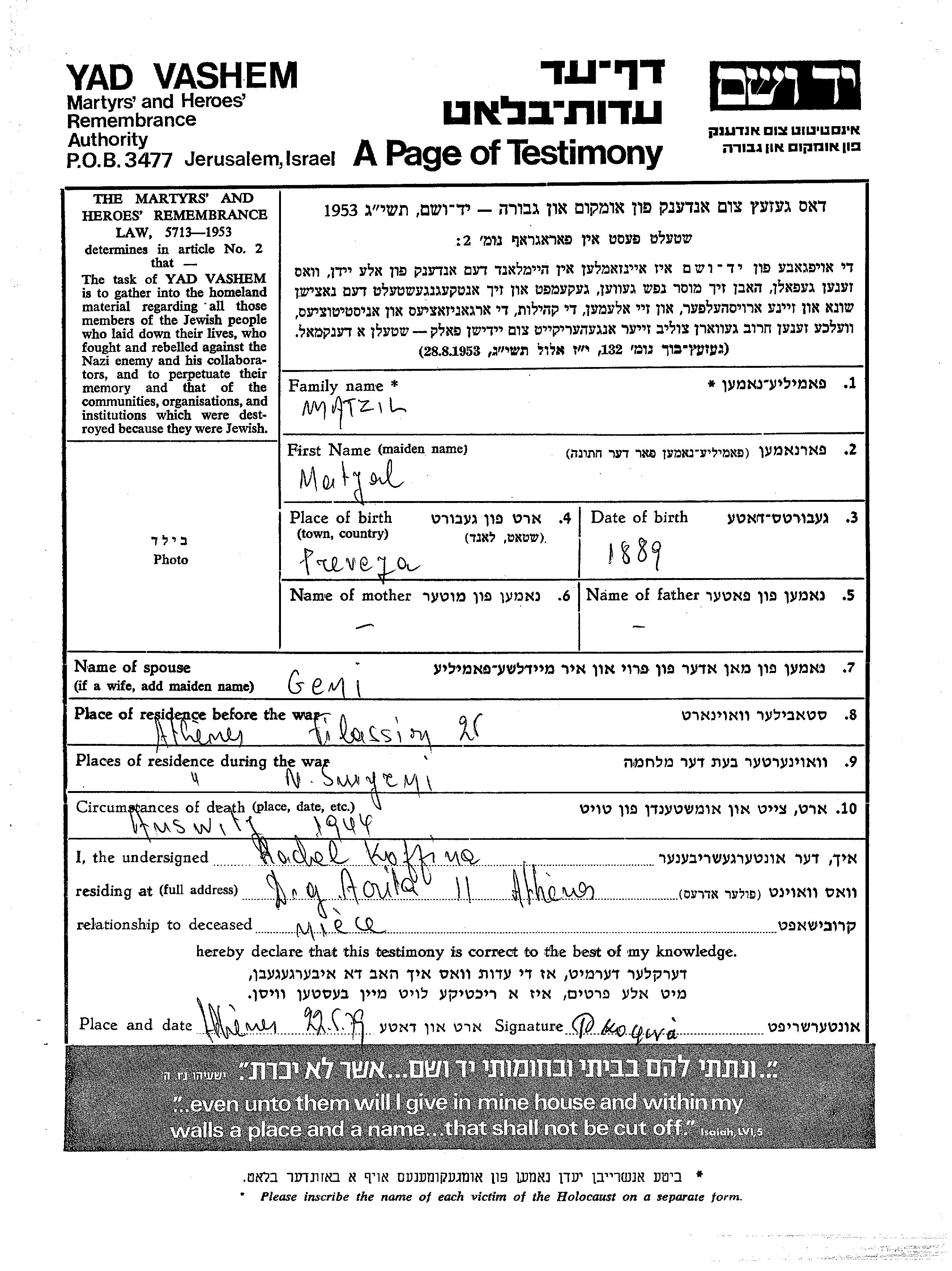 Matzal Matzil wurde im Jahr 1889 in Preveza, Griechenland geboren. Sie war mit Geni Verheiratet. Vor dem Zweiten Weltkrieg lebte sie in Athenai, Griechenland. Während des Krieges war sie in Athenai, Griechenland.