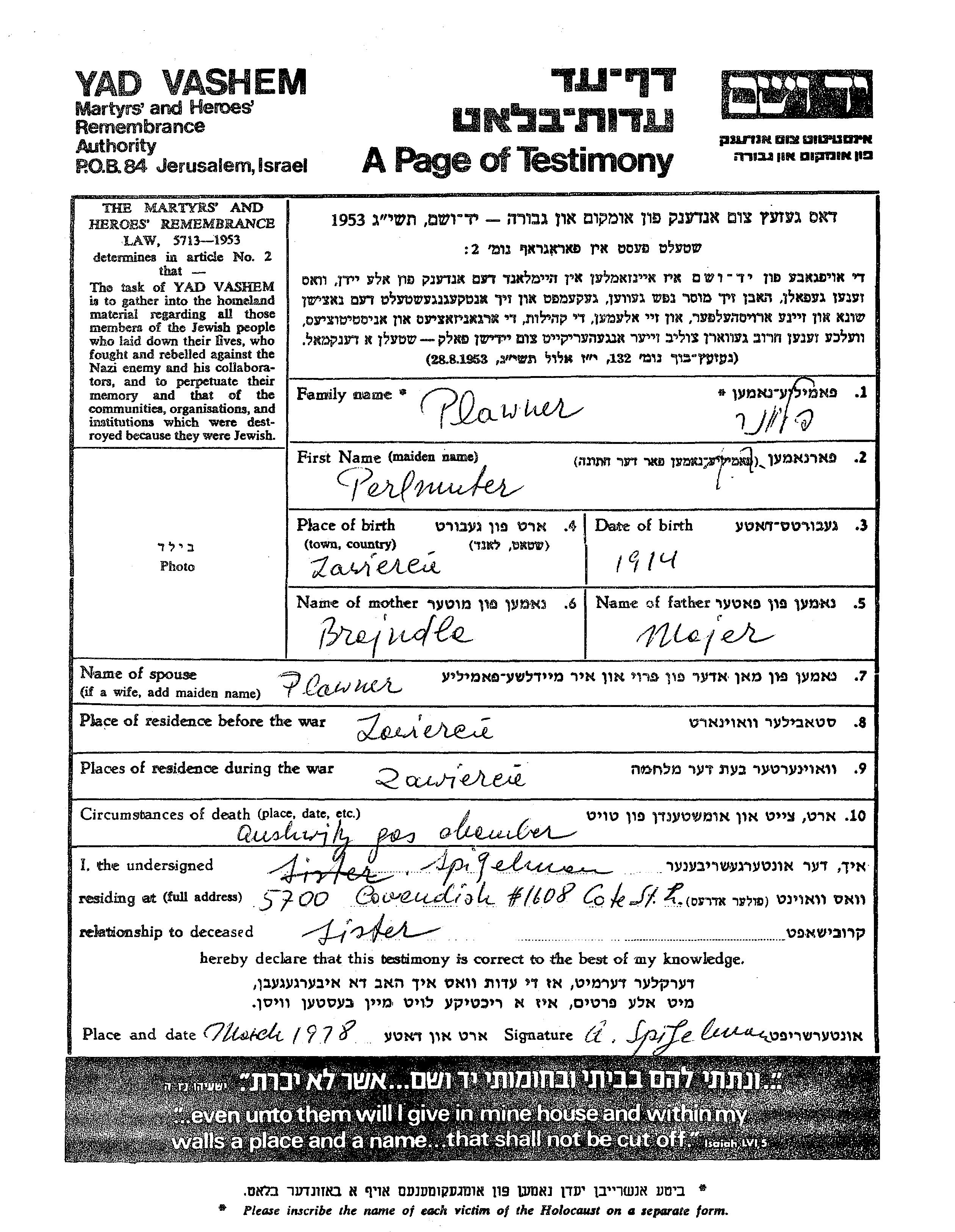 Vorname unbekannt Plawner, geb. Perlmuter wurde im Jahr 1914 in Zawiercie, Polen geboren. Sie war die Tochter von Majer und Brejndla. Vor dem Zweiten Weltkrieg lebte sie in Zawiercie, Polen. Während des Krieges war sie in Zawiercie, Polen.