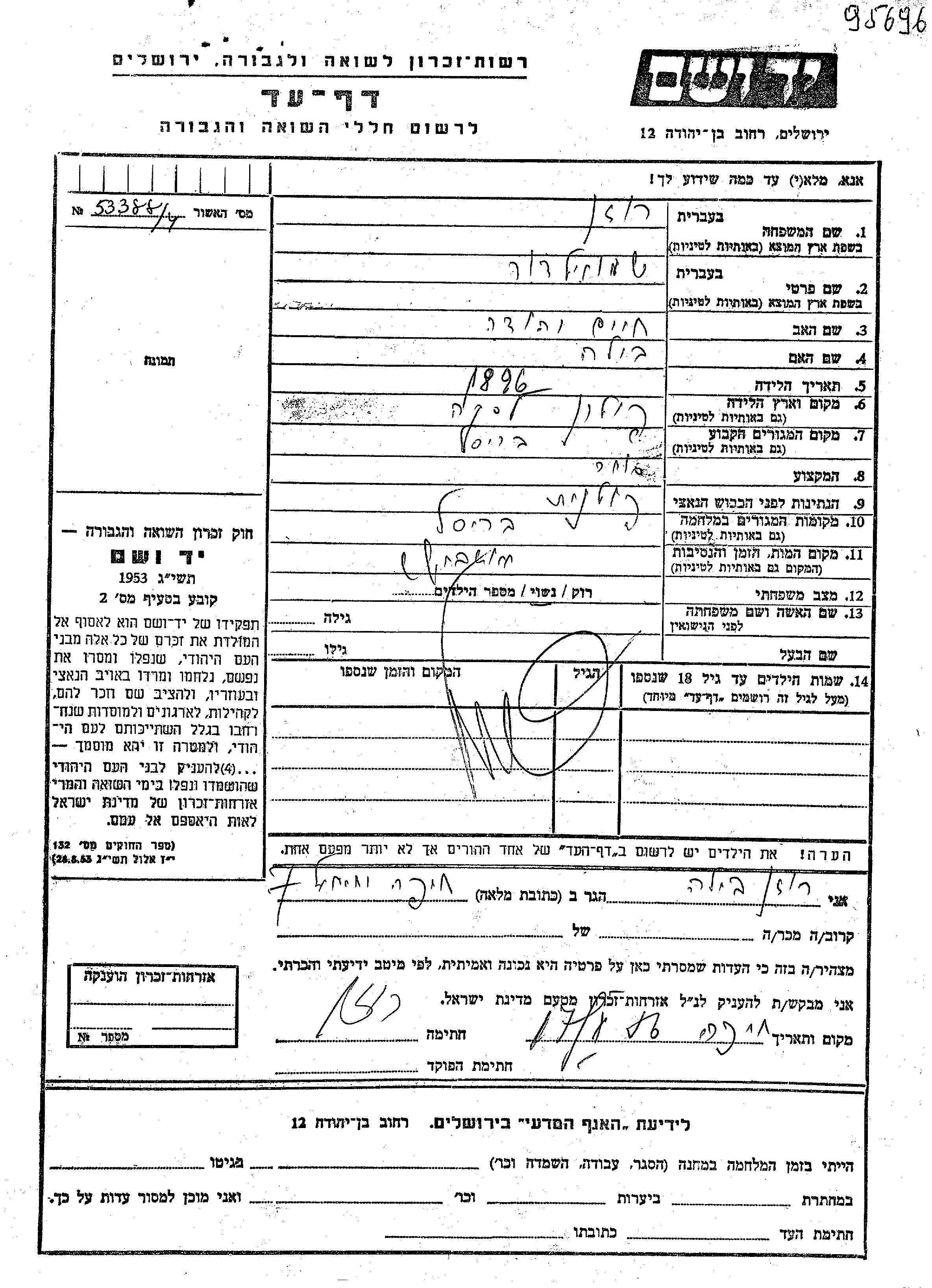 Shmuel Dor Rozen wurde im Jahr 1896 in Lask, Polen geboren. Er war der Sohn von Khaim Yehuda und Bila. Er war Kaufmann/-frau und Verheiratet. Vor dem Zweiten Weltkrieg lebte er in Bruxelles, Belgien. Während des Krieges war er in Bruxelles, Belgien.