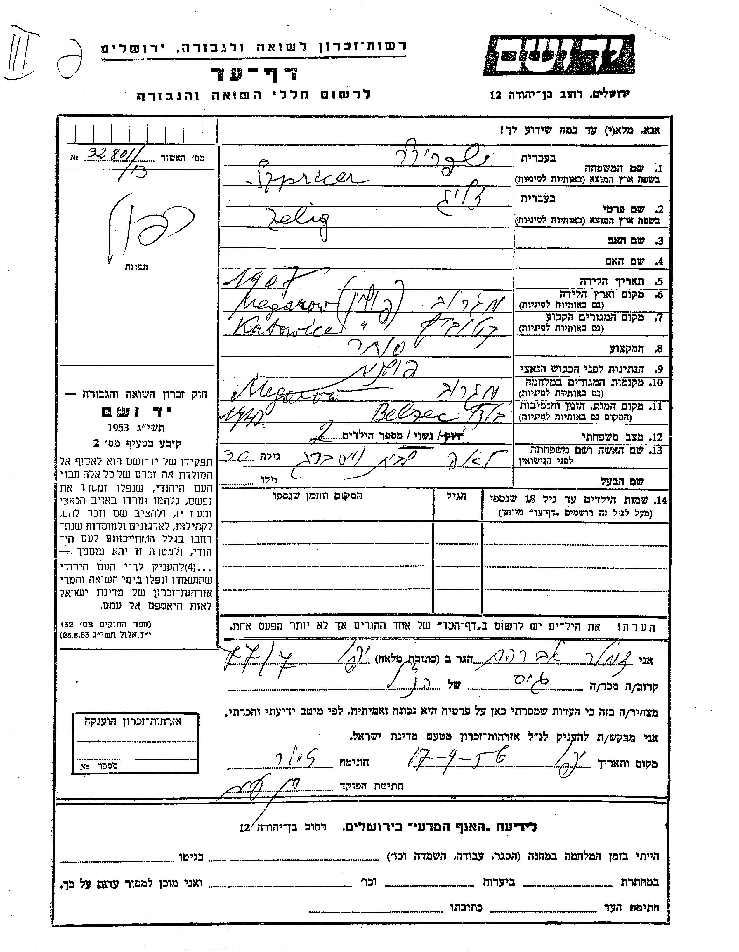 Zelig Szpricer wurde im Jahr 1907 in Magerow, Polen geboren. Er war Kaufmann/-frau und mit Lea, geb. Veisberg Verheiratet. Vor dem Zweiten Weltkrieg lebte er in Katowice, Polen. Während des Krieges war er in Magerow, Polen.