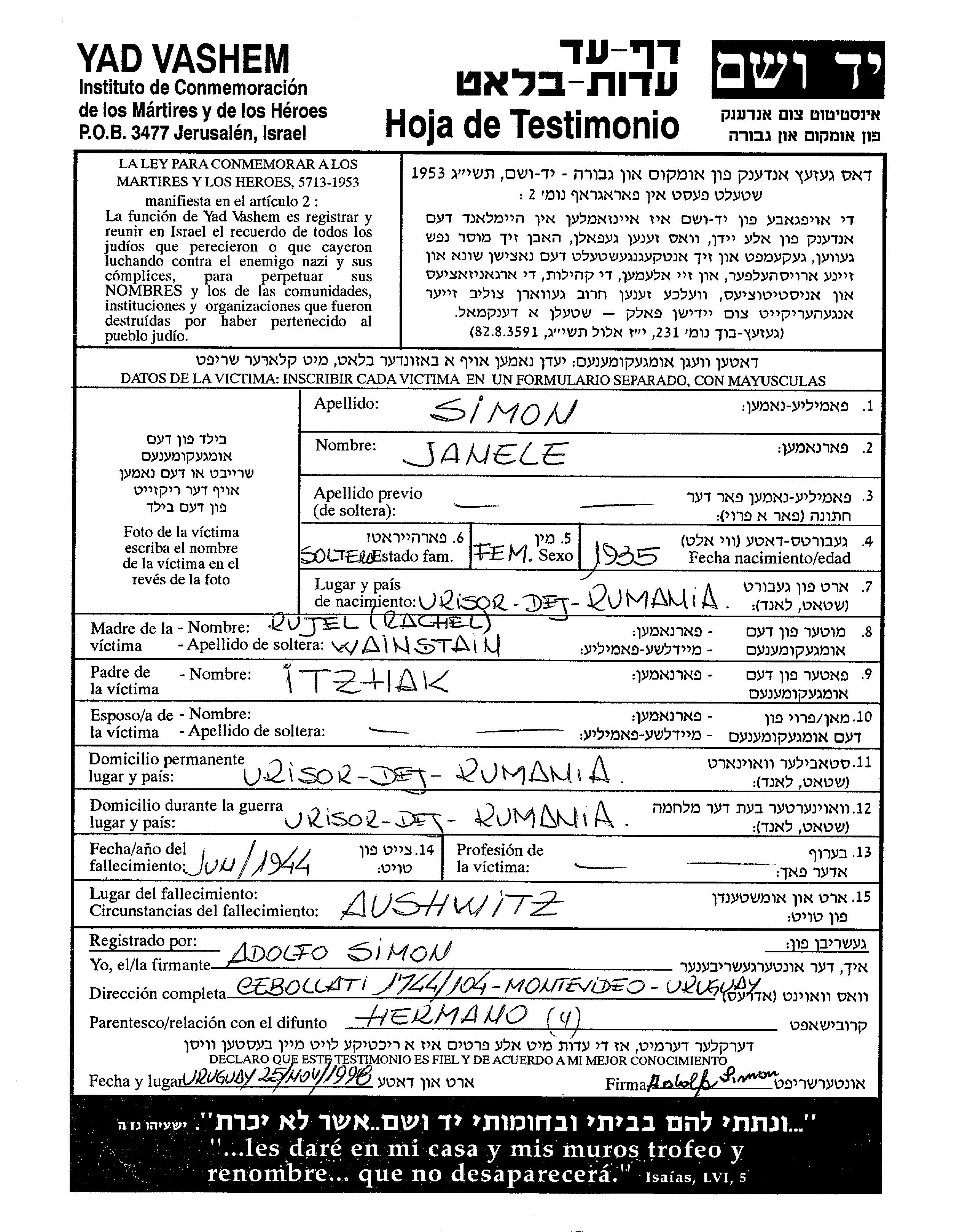 Jahele Simon wurde im Jahr 1935 in Urisor, Rumänien geboren. Er war der Sohn von Itzhak und Rujel. Er war Ledig. Vor dem Zweiten Weltkrieg lebte er in Urisor, Rumänien. Während des Krieges war er in Urisor, Rumänien.