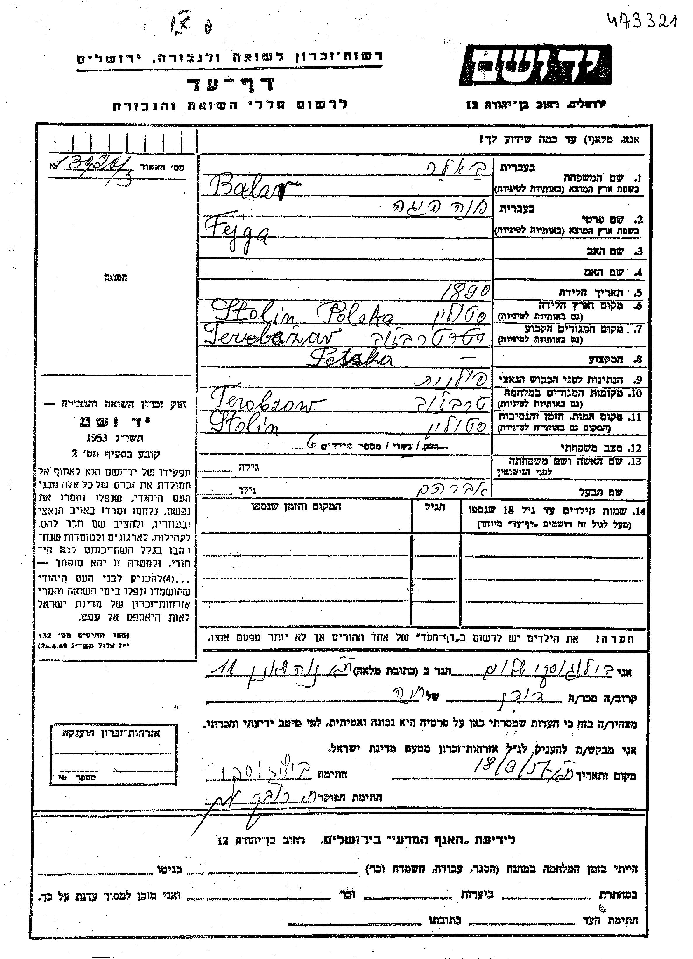 Fejga Khana Balar wurde im Jahr 1890 in Stolin, Polen geboren. Sie war mit Avraham Verheiratet. Vor dem Zweiten Weltkrieg lebte sie in Terebiezow, Polen. Während des Krieges war sie in Terebiezow, Polen.