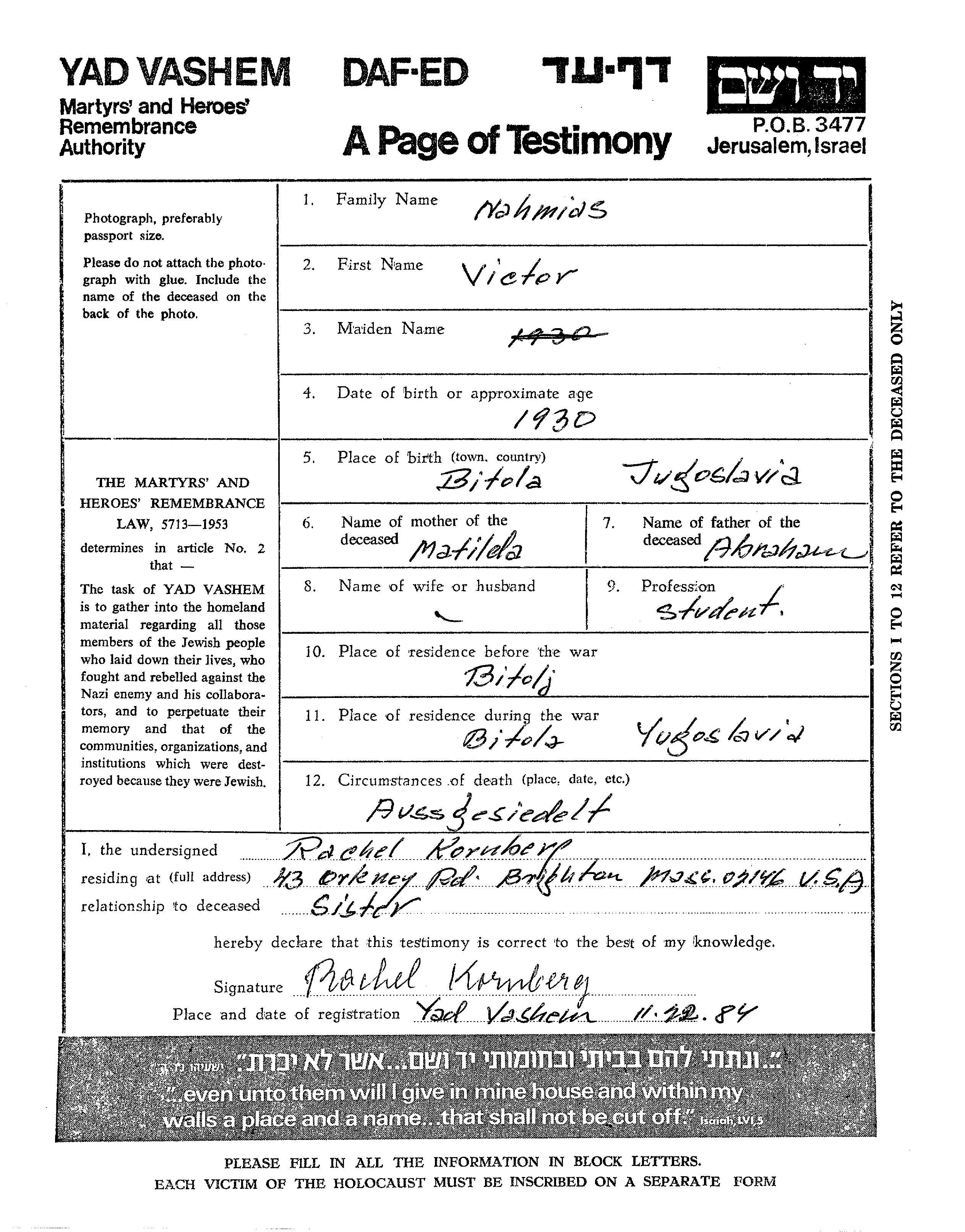 Victor Nahmias wurde im Jahr 1930 in Bitola, Jugoslawien geboren. Er war der Sohn von Abraham und Matilda. Er war Schüler/-in. Vor dem Zweiten Weltkrieg lebte er in Bitola, Jugoslawien. Während des Krieges war er in Bitola, Jugoslawien.