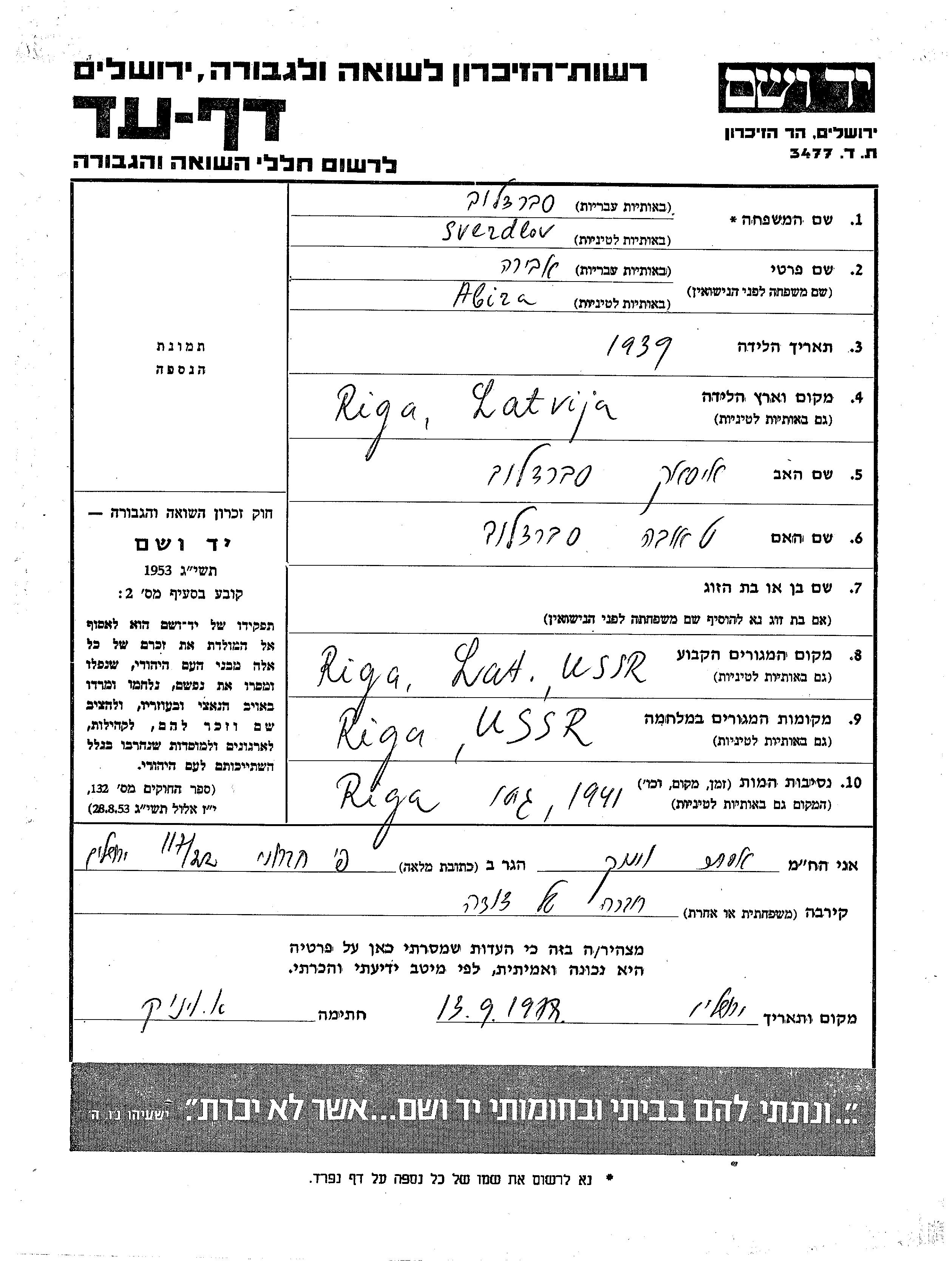 Abira Sverdlov wurde im Jahr 1939 in Riga, Lettland geboren. Sie war die Tochter von Yitzkhak und Tauba. Vor dem Zweiten Weltkrieg lebte sie in Riga, Lettland. Während des Krieges war sie in Riga, Lettland.