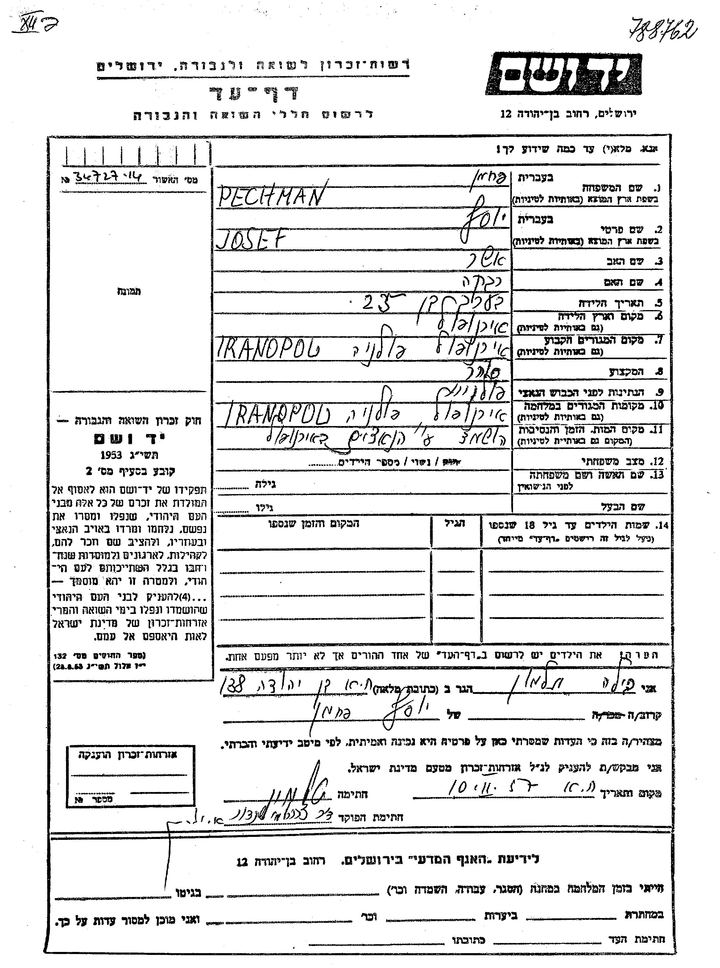Josef Pechman wurde in Tarnopol, Polen geboren. Er war der Sohn von Asher und Rivka. Er war Kaufmann/-frau und Verheiratet. Vor dem Zweiten Weltkrieg lebte er in Tarnopol, Polen. Während des Krieges war er in Tarnopol, Polen.